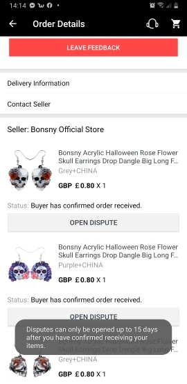 Заказ до Татарстана шёл около 1,5 месяца. Заказывала специально на Хеллоуин, но увы, пришли позже на неделю с лишним, но тут работа почты, а не вина продавца. Посылка на сайте почты к сожалению не отслеживается, бросили в почтовый ящик, что очень удобно. Серьги миленькие, останутся на следующей год. Спасибо продавцу.