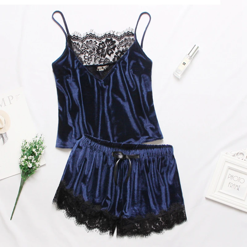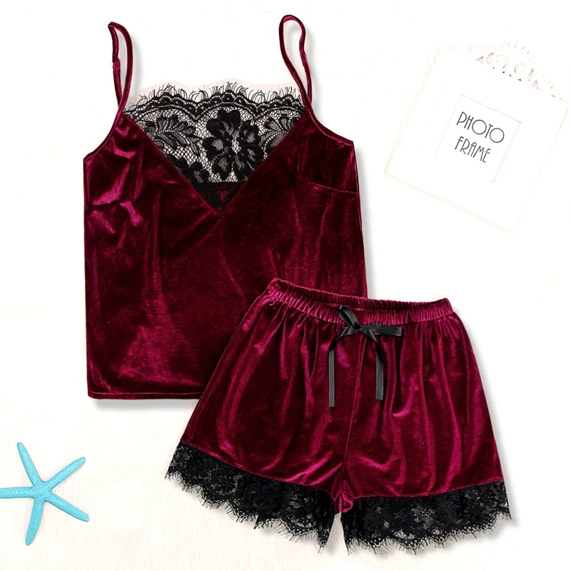 Женский бархатный пижамный комплект, одежда для сна, пикантный Повседневный пижамный комплект, Черная кружевная Пижама с V-образным вырезом, милая майка без рукавов, топ и шорты