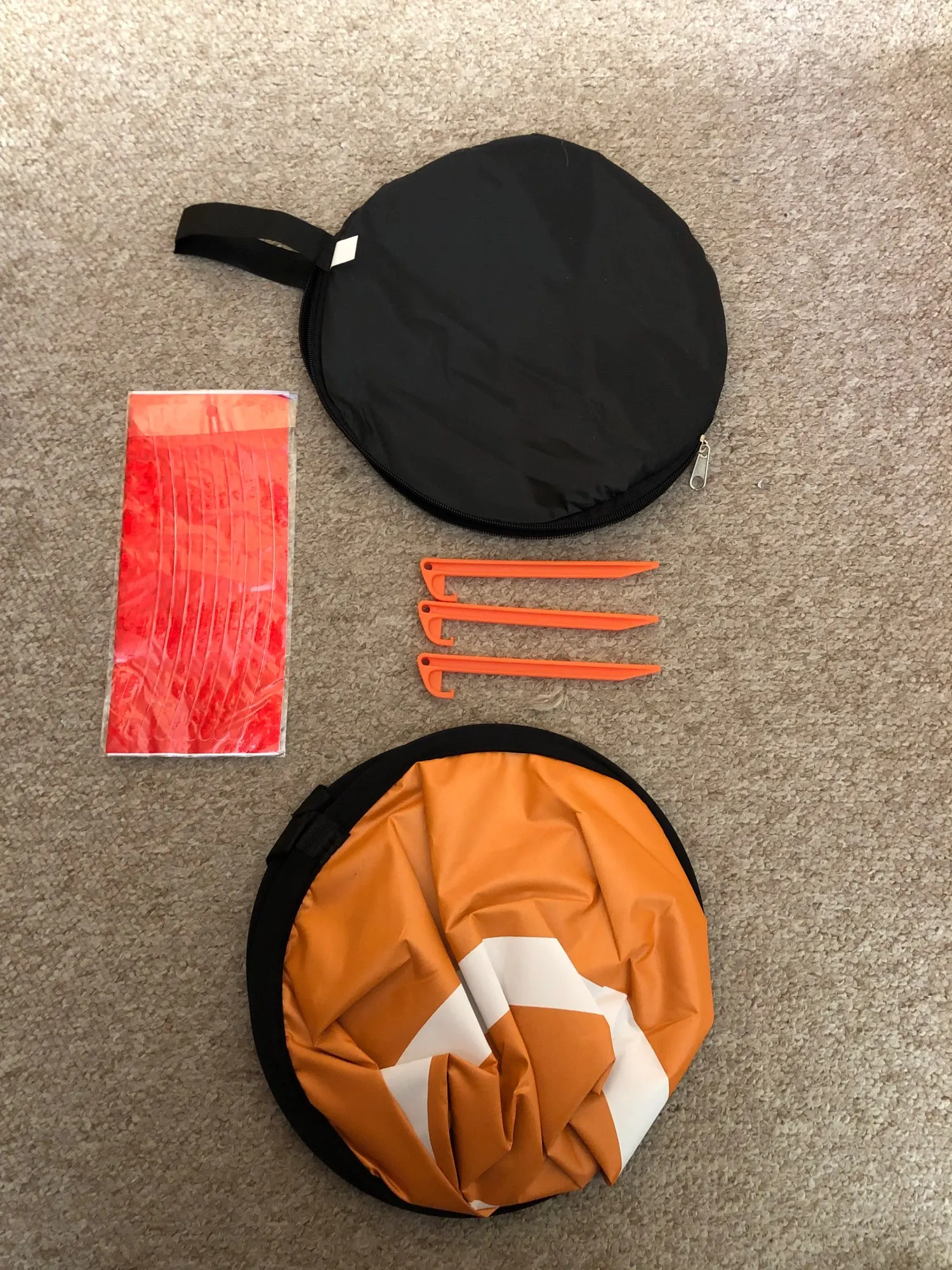 в точности как в описании. в комплекте 3 колышка и светоотражающие полоски. площадка 110 см огромная, DJI Inspire поместится без проблем