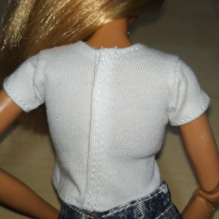 Доставка около месяца. Заказала 2 футболки, белая чуть короче и свободнее. Качество - огонь, от швов и липучки до качества ткани. На фото с видом сзади я криво застегнула, сразу не заметила, с выкройкой и швами всё ок. На фото на стандартном теле Барби МТМ.