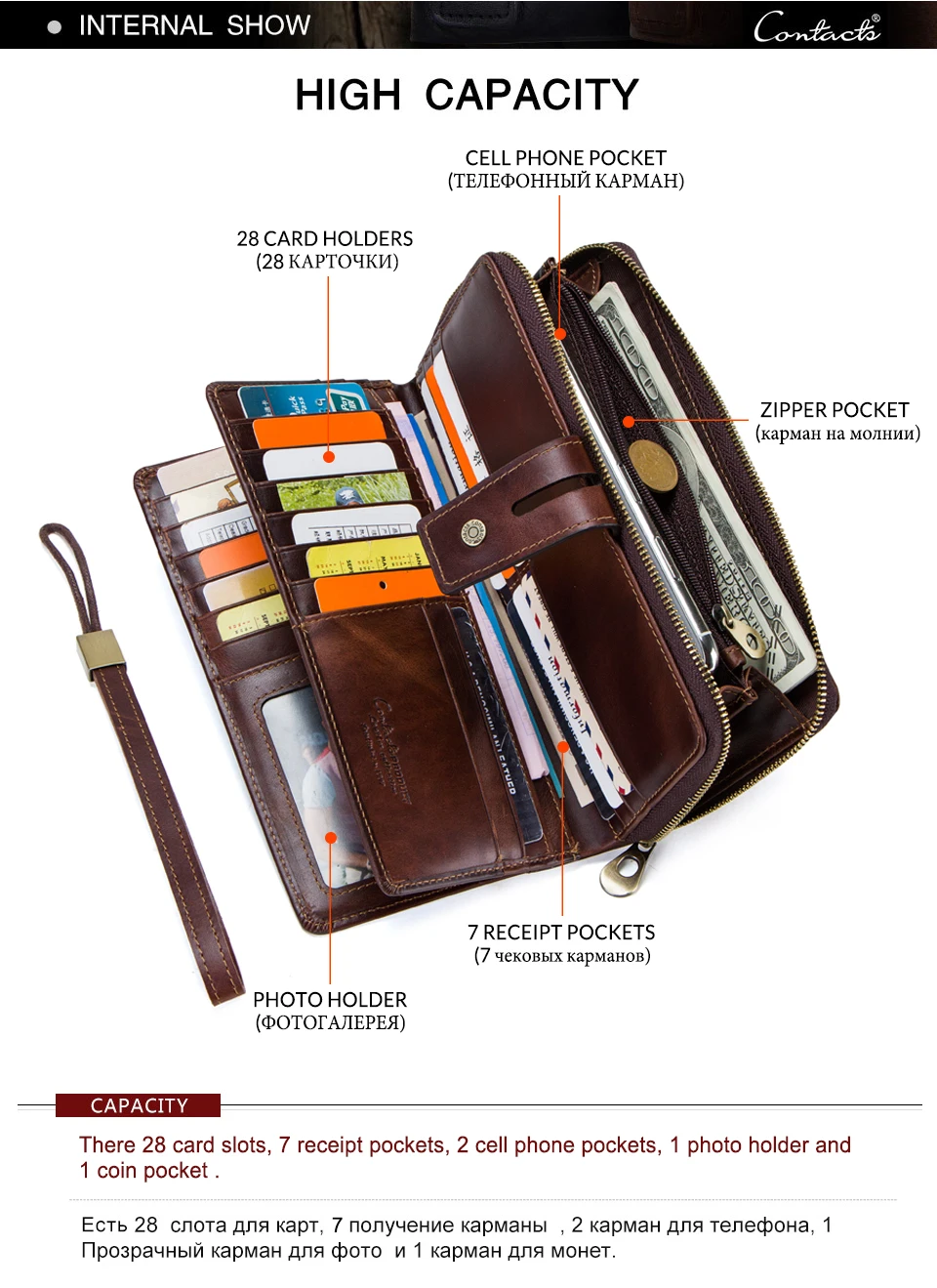 Capacity28 card slots,1 photo holder, 2 cellphone holder, 2 zipper pockets