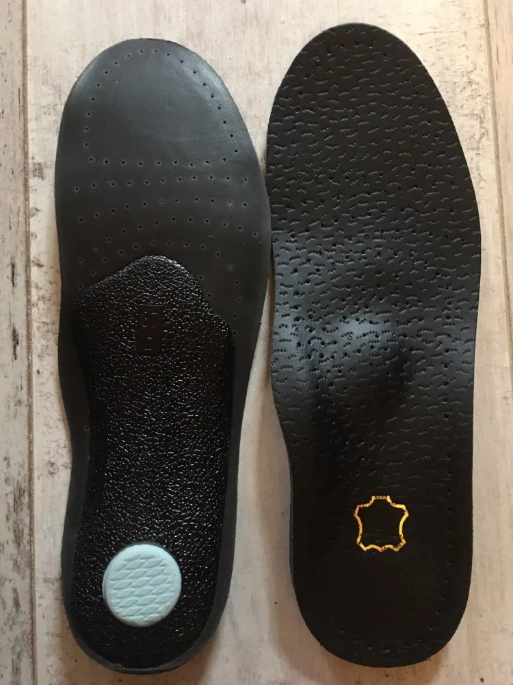 Стельки соответствуют описанию, реально натуральная кожа, достаточно тонкие, помещаются в любую обувь, свод стопы поддерживают слабее, чем красные, ортопедическая арка ниже, но красные намного толще. Быстрая доставка