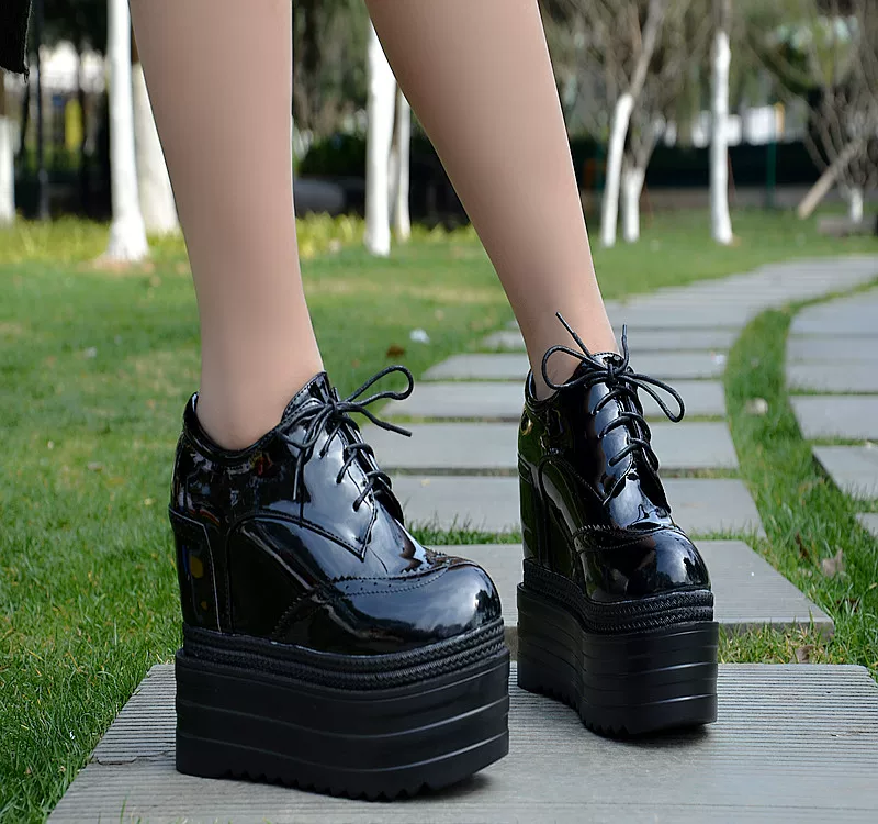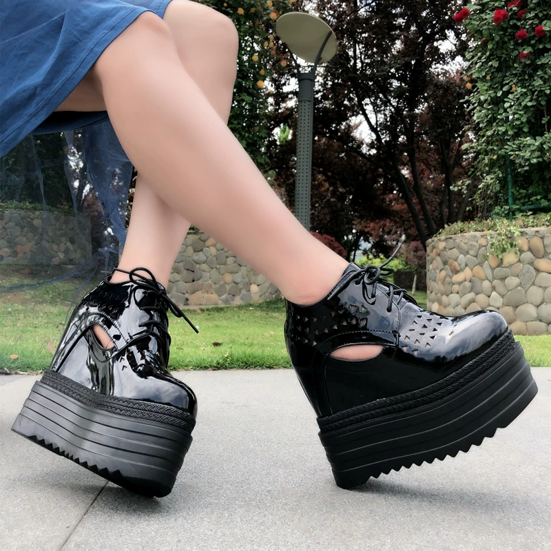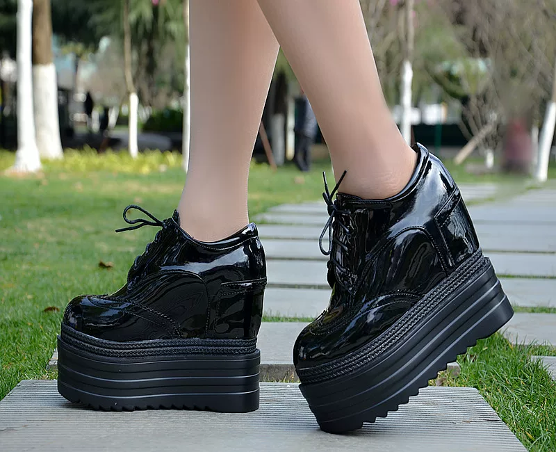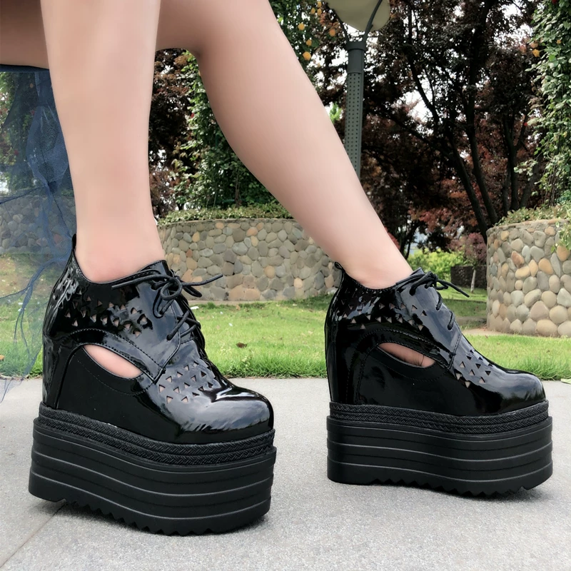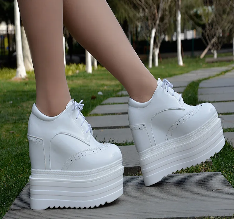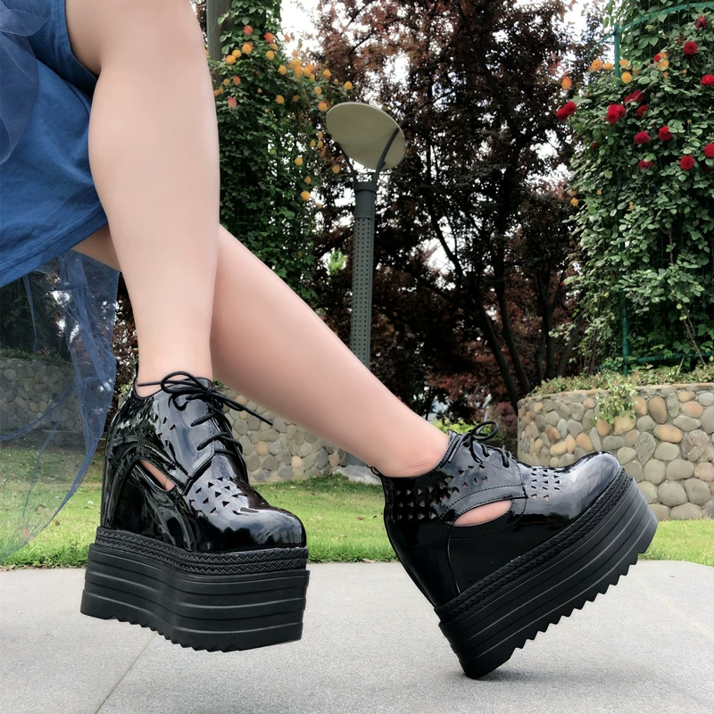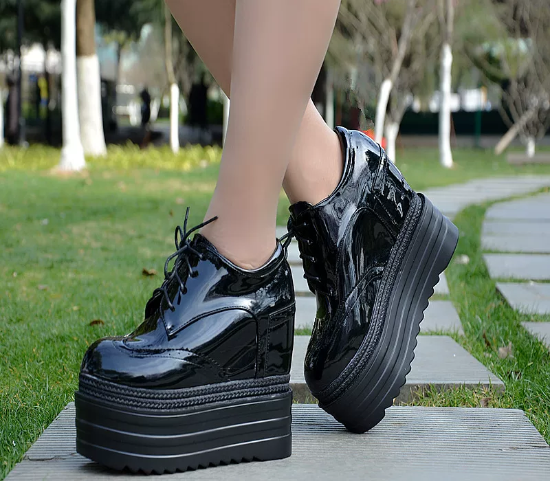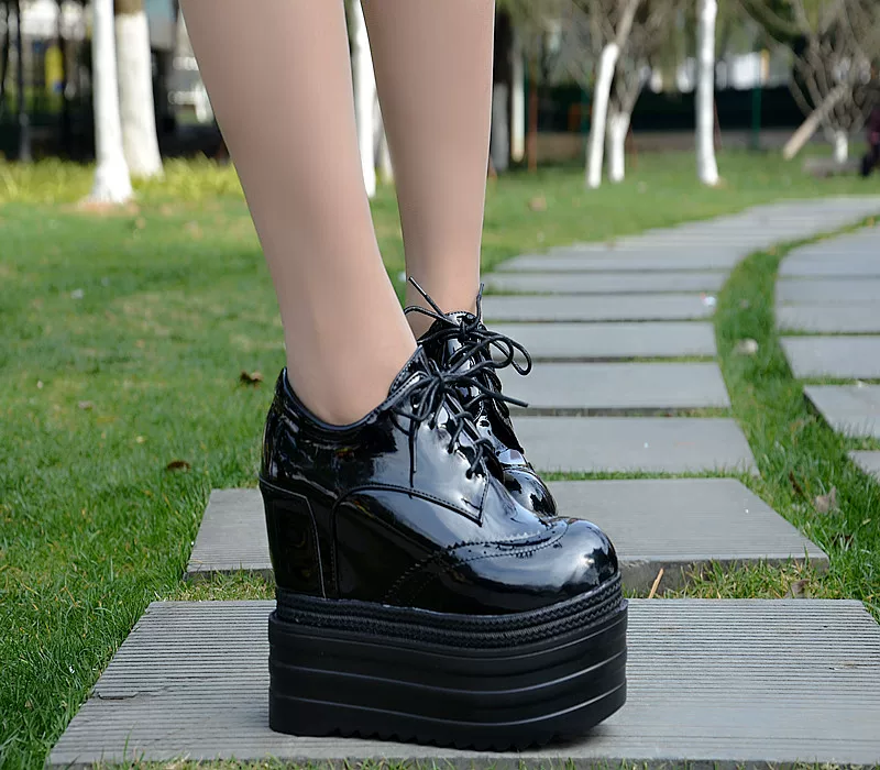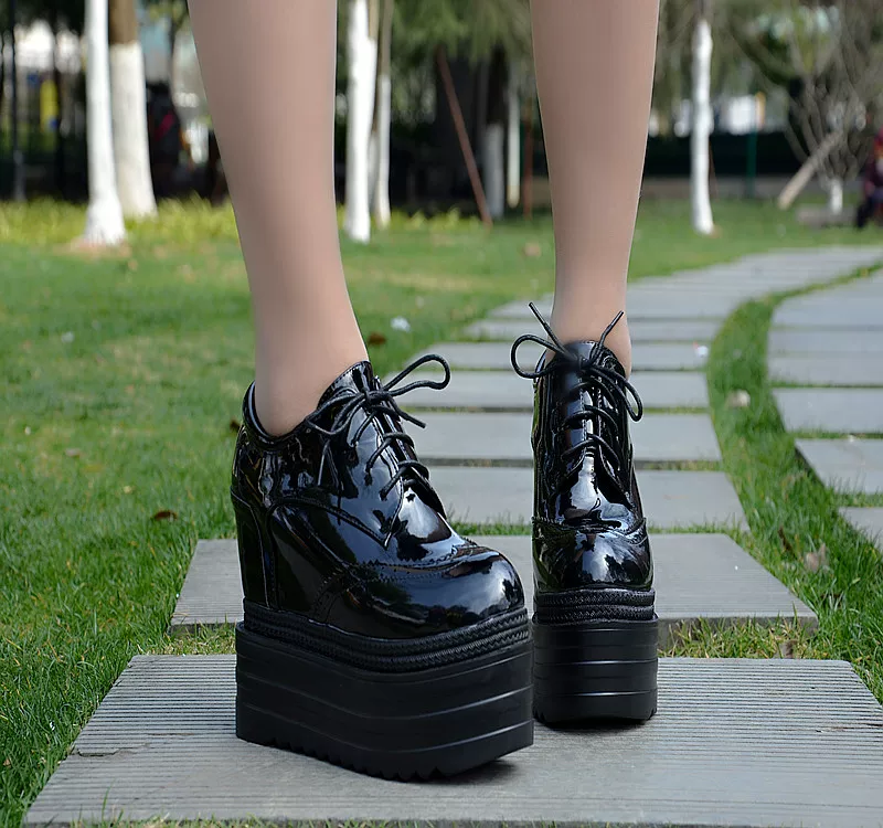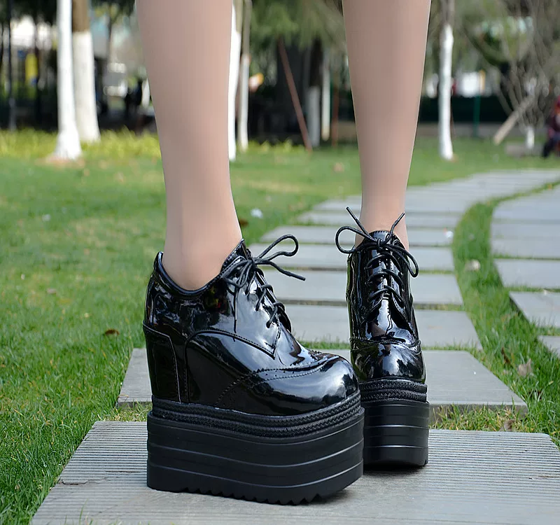 Новая женская обувь на рифленой подошве обувь на очень высоком каблуке 14 см с круглым носком модная женская обувь из лакированной кожи, увеличивающая рост