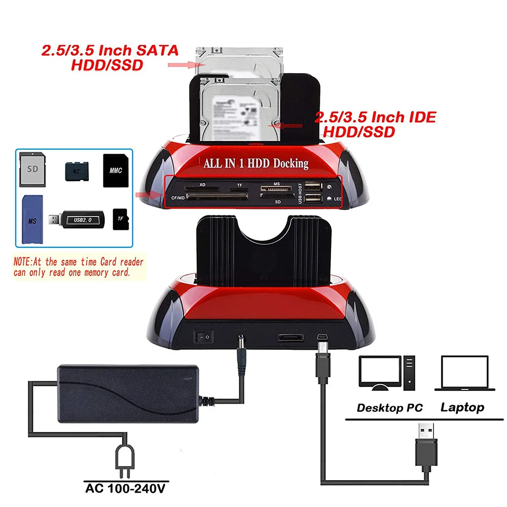 Все в одном, док-станция для жесткого диска с кард-ридер для карт, в которое корпус для жесткого диска 2,5/3,5 дюймов SATA/IDE/SATAВсе в одном док-станция мульти кард-ридер поставляется с богатыми типами слотов и поддерживает все типы IDE жесткого диска, чтобы удовлетворить ваш высокий спрос на использование мульти-карты в то же время без частых подключений.Он может напрямую обмениваться данными между 2 различными типами HDD ( SATA и IDE ). Вы можете как копию транспортной накладной или создайте резервную копию своих файлы удобно даже для разных размеров (3,5 дюймов и 2,5 дюймов HDD ).Основные характеристики:-Поддержка горячей вилки, может разобрать жесткий диск без каких-либо инструментов-Скорость передачи данных USB 2,0 до 480 МБ/с.-Поддержка все 2,5 дюйма или 3,5 дюйма IDE / SATA жесткого диска какого-либо потенциала-Порт Bulit-in eSATA, скорость передачи данных до 3 Гбит/с-Встроенный ОТБ, OTC, 2 порта USB 2,0, двойной IDE/SATA, 5-контактный разъем, разъем TF / micro SD, MS слот, слот XD и т. д.-Поддержка карт памяти до 64 Гб (не входит в комплект)-Поддержка копирования жесткого диска, когда он не подключается к компьютеру, жесткий диск может быть реализован как копия-Поддержка Window 98 / 98SE / ME / 2000 / XP / Vista / Win 7 / Mac / Linux/и т. Д.-Вход источника питания: 100 - 240 В пер. тока, 50 / 60 Гц, 1.5AПосылка:1 x eSATA Dual IDE все в одном кардридер док-станции,1 х адаптер питания,1 x Кабель питания,1 х USB кабель