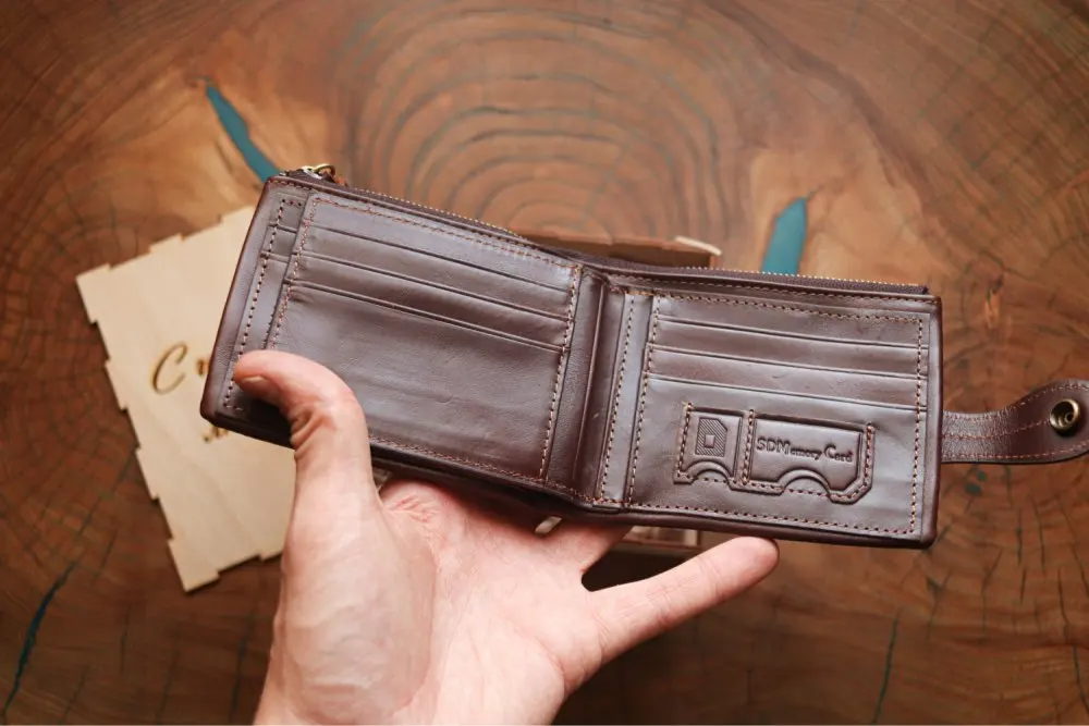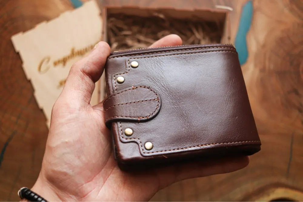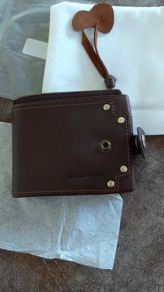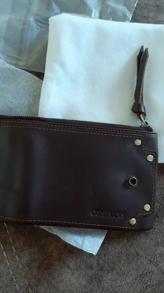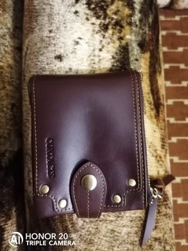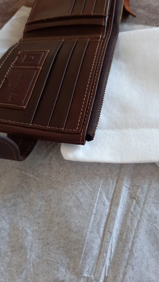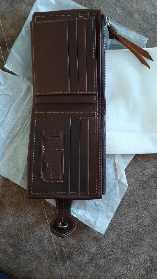 Кошелек пришёл быстро, меньше чем за месяц. Он не полностью кожаный, только основание, внутри все отделения для карт - это не кожа. Молния пришита высоко над краем, сильно выступает. На мой взгляд это не красиво.Кожанный хвост на молнии очень грубый, при носке в кармане будет мешать. кошелёк на 3+.