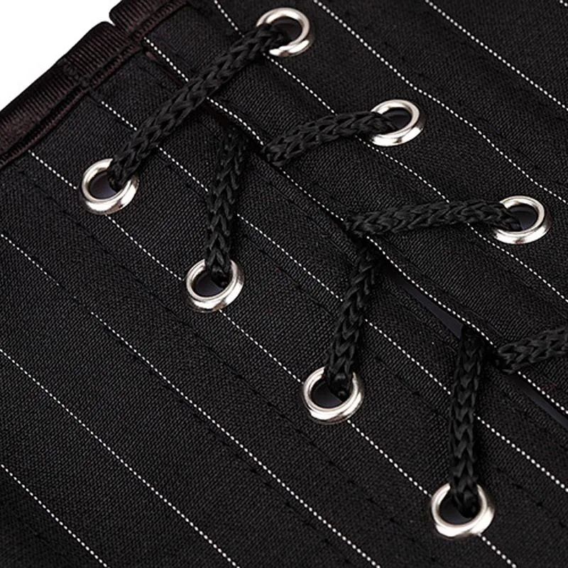 Утягивающий корсет в полоску с мини-юбкой и ремнем. На шнуровке сзади не завязывается.
