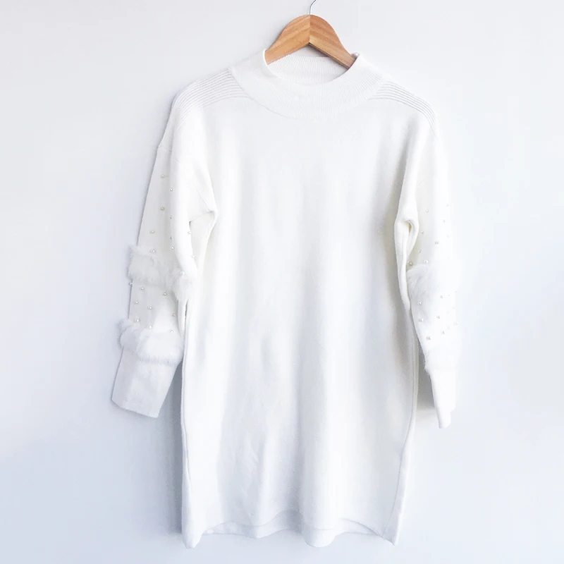 Пуловер женский, с жемчугом, свободный, с кроличьим мехом, теплый, зимний, вязаный, оверсайз