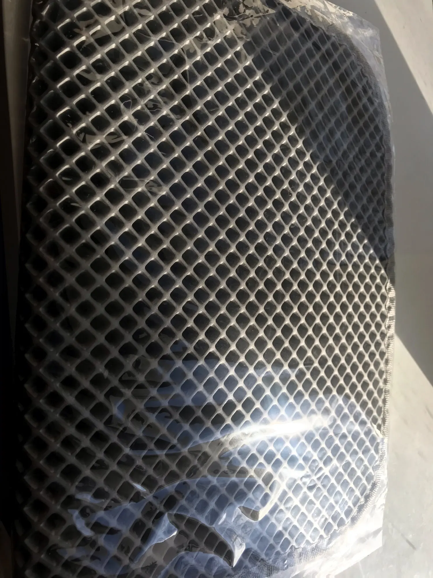 Отличный коврик, хоть и не дешевый. Доставка 11 дней в Пятерочку. Был свернут несколько раз. После вскрытия расправился моментально. Запах пластика присутствовал, но проветрился за несколько часов. Ячейки крупные, наполнитель должен хорошо проваливаться. Дно пришито с трех сторон, одна сторона фиксируется кусочками контактной ленты. Дно тоненькое, но обработано непромокаемым составом. В общем, отличный товар, хоть и недешевый, повторяю.