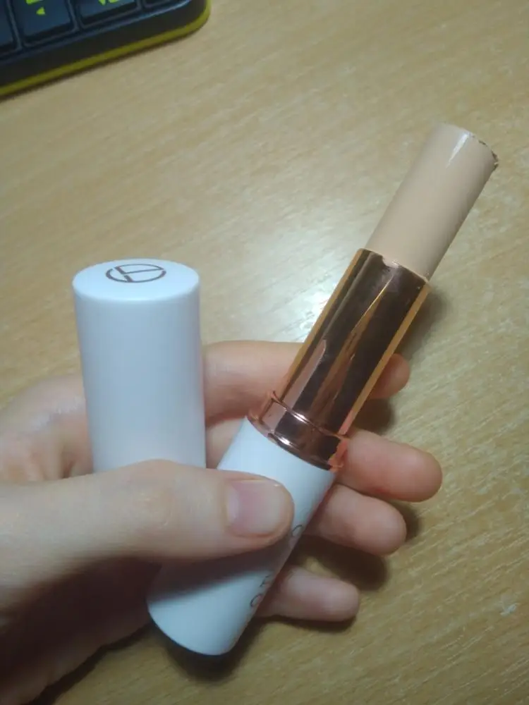 Заказ вышел в 350₽. Пудра пришла в запаянной коробочке и в воздушном пакете, а стик просто валялся рядом в почтовом пакете. Почему-то, коробка со стиком не была запаяна в слюду. Я брала самый светлый, ivory (02), но из-за отзывов ощущение, будто мне прислали не тот цвет, хоть и стоит пометка "2". Выкручивается как помада, длина стержня 3см. Перекрытие среднее. Все шелушения, неровности и мелкие волоски подчёркивает. Не сушит, поры не забил, в течении дня не скатывается. На коже виден, ложится шероховато (на фото и при искусственном освещении выглядит ещё более менее нормально, но в жизни это звездец как заметно). На первом фото кожа "до", на втором цвет (на моём фото выглядит светлее), на третьем "после", нанесла средства мало. Понравилось то, что нет нужды использовать пудру, ибо финиш матовый, пудровый такой, и жирный блеск на лице не появляется довольно долго (а кожа у меня жирная)