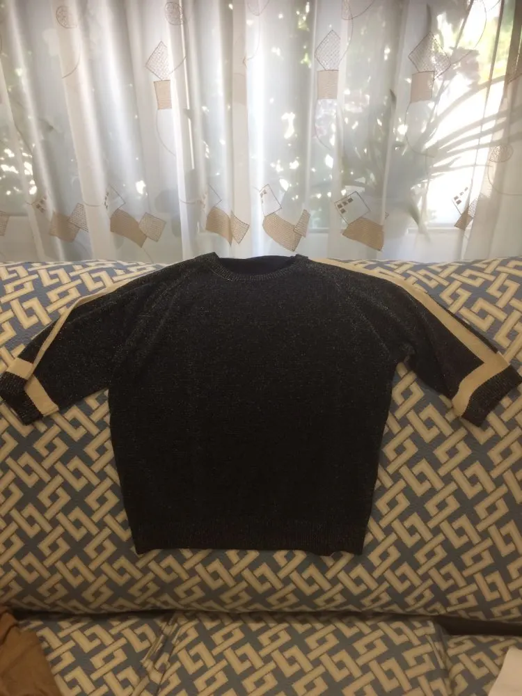 тонкий, приятный к телу свиторок. Хоть материал с блестками, фасон, полоски на рукавах упрощают. Маломерит, только-только на ог 104.