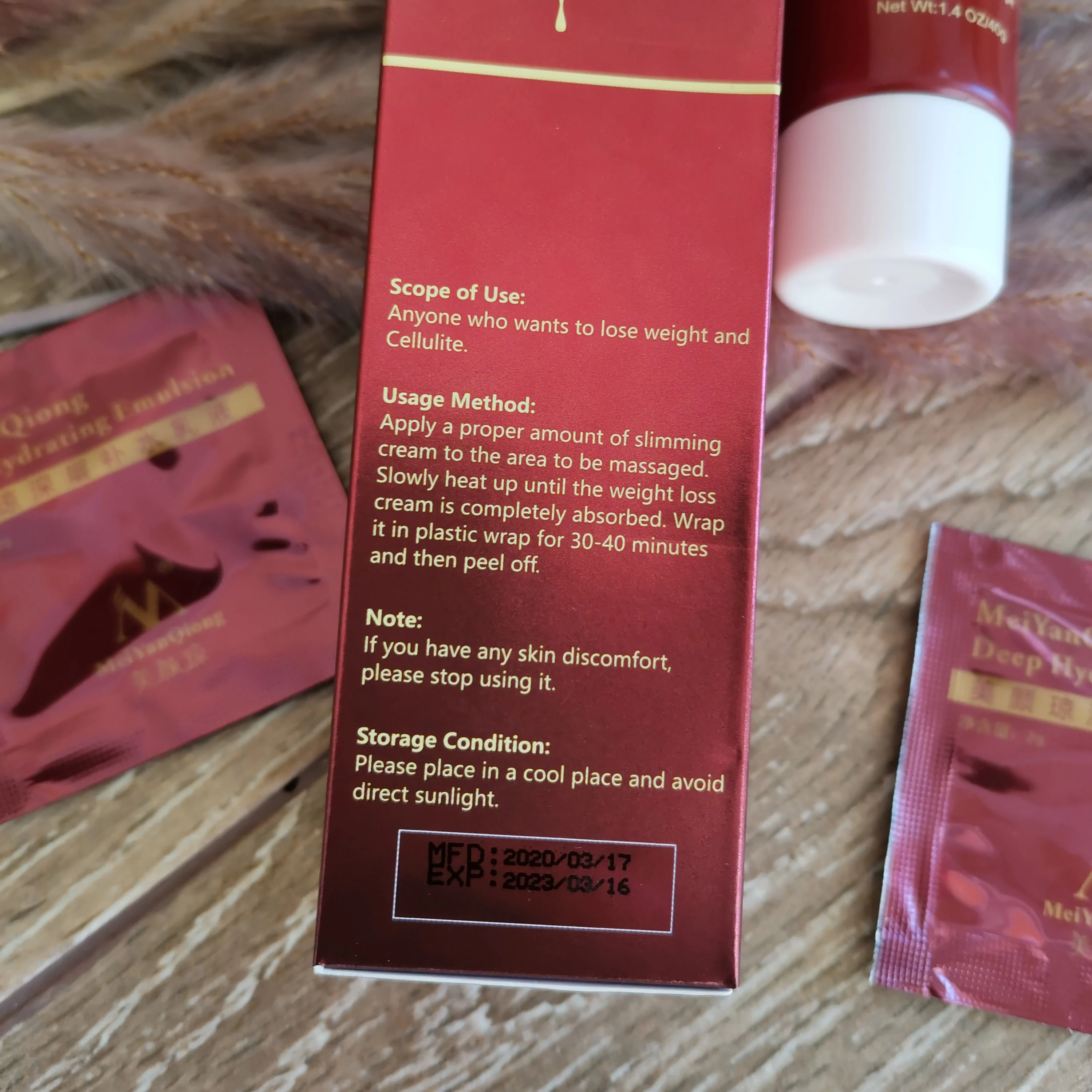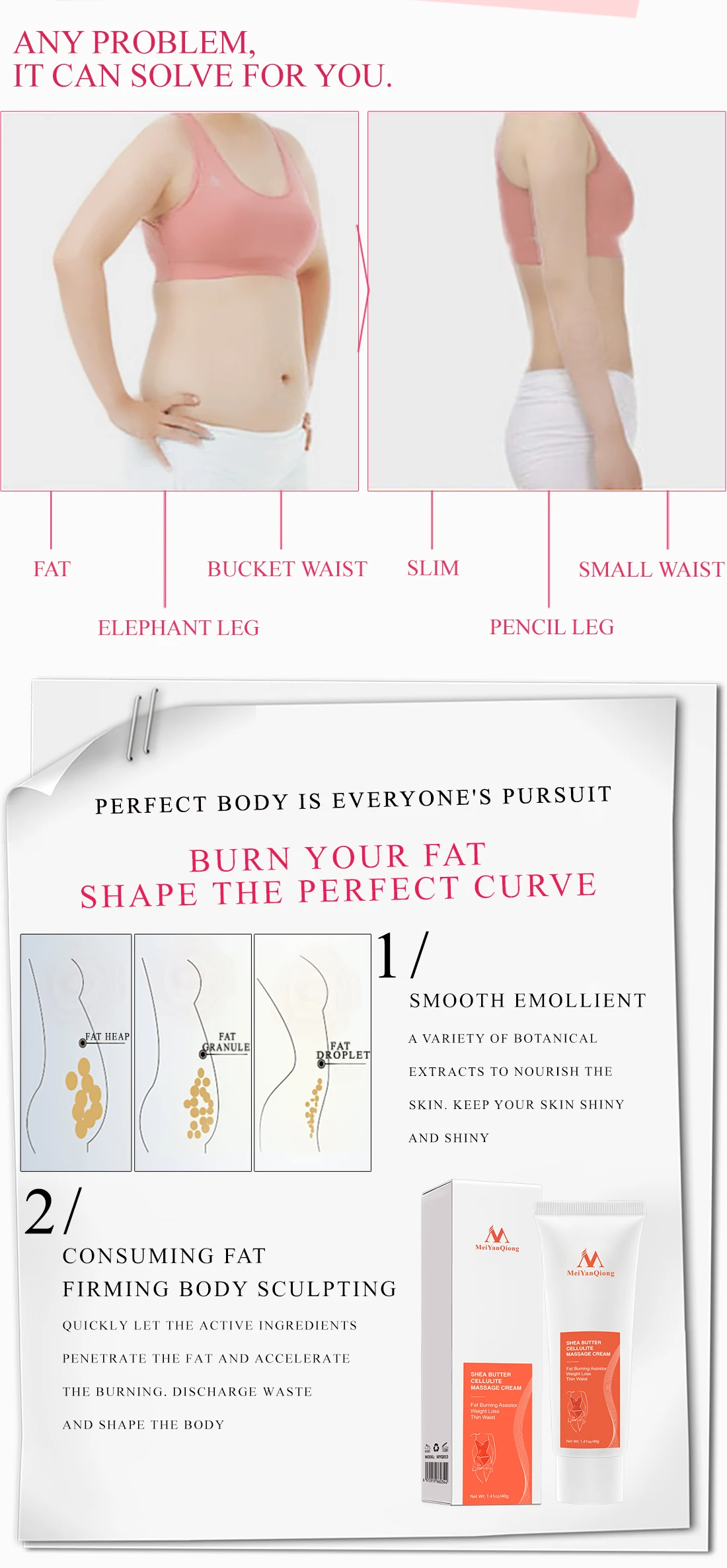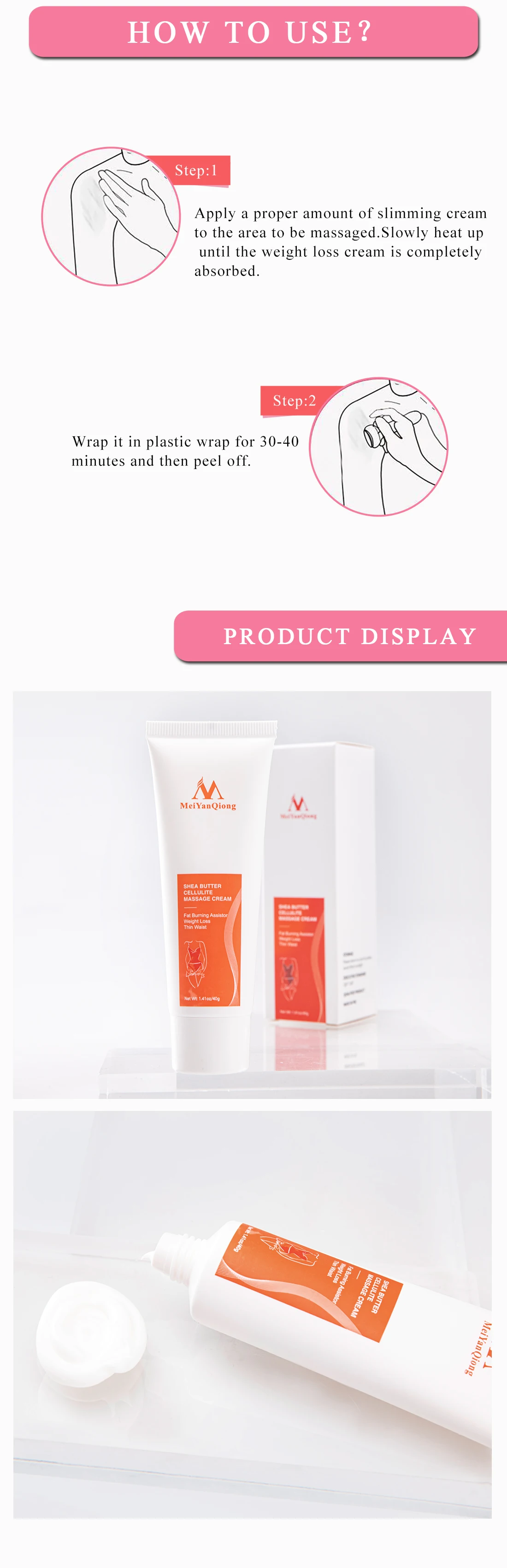 Крем содержит различные смягчающие вещества для тела, нежную текстуру, которая легко проникает и поглощает, поднимая и укрепляя, полностью сжигая ваш жир, после непрерывного использования, формируя идеальные линии талии и ног. Способ использования: Нанесите необходимое количество крема для похудения на область для массажа. Медленно нагревается до полного поглощения крем для похудения. Оберните его в пластиковую пленку в течение 30-40 минут, а затем отклейте.