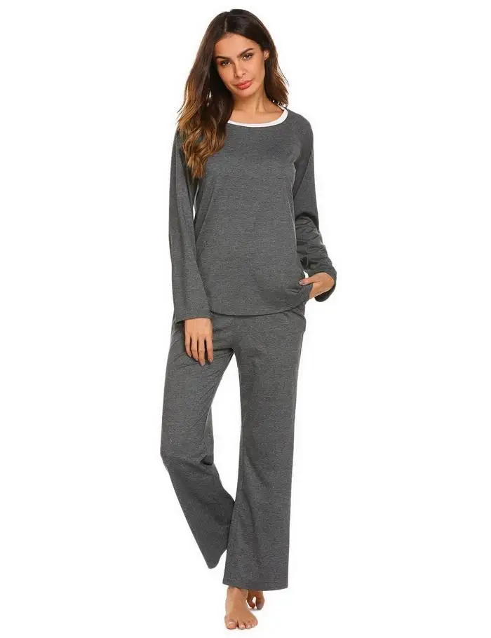 FINEJO женская пижама, осенняя однотонная, повседневная, с круглым вырезом, с длинным рукавом, новая модная, свободная, хлопковая, удобная, Feminina, комплект одежды для сна