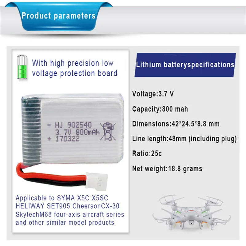 3,7 в 800 мАч 902540 Lipo батарея 30C для SYMA X5C X5SC X5SW X5HW X5UW CX-30 TianKe M68 RC Quadcopter 3,7 в аккумулятор