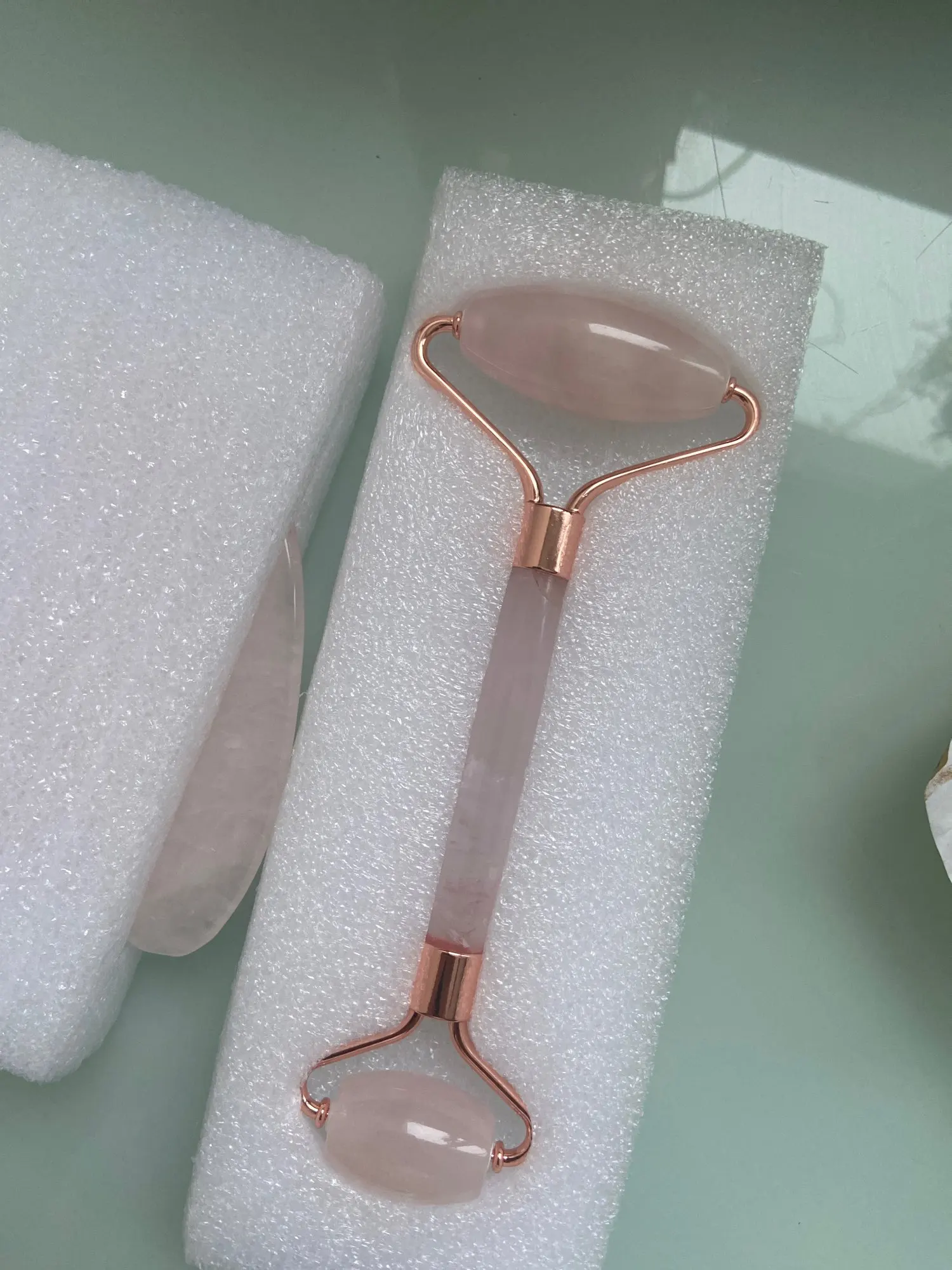 Заказ пришёл быстро, 2 недели. Упаковано все отлично в пенопласт, отдельно массажёр и отдельно гуаша. На большом валике есть углубление, достаточно глубокое с острыми краями, надеюсь не будет царапать. Все остальное - супер. Брала на подарки, сама не пользовалась. Выглядит очень презентабельно, видно, что натуральный камень.
