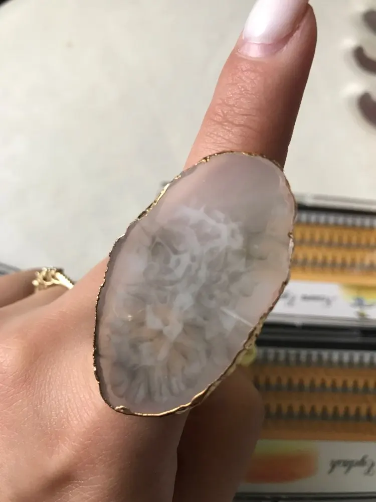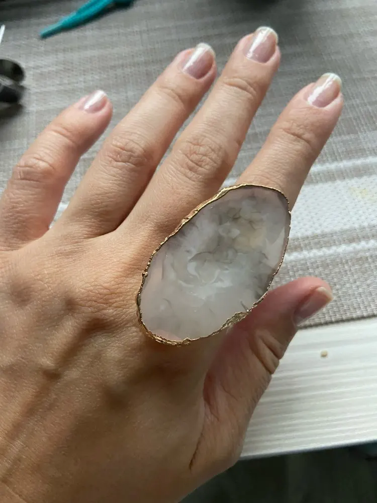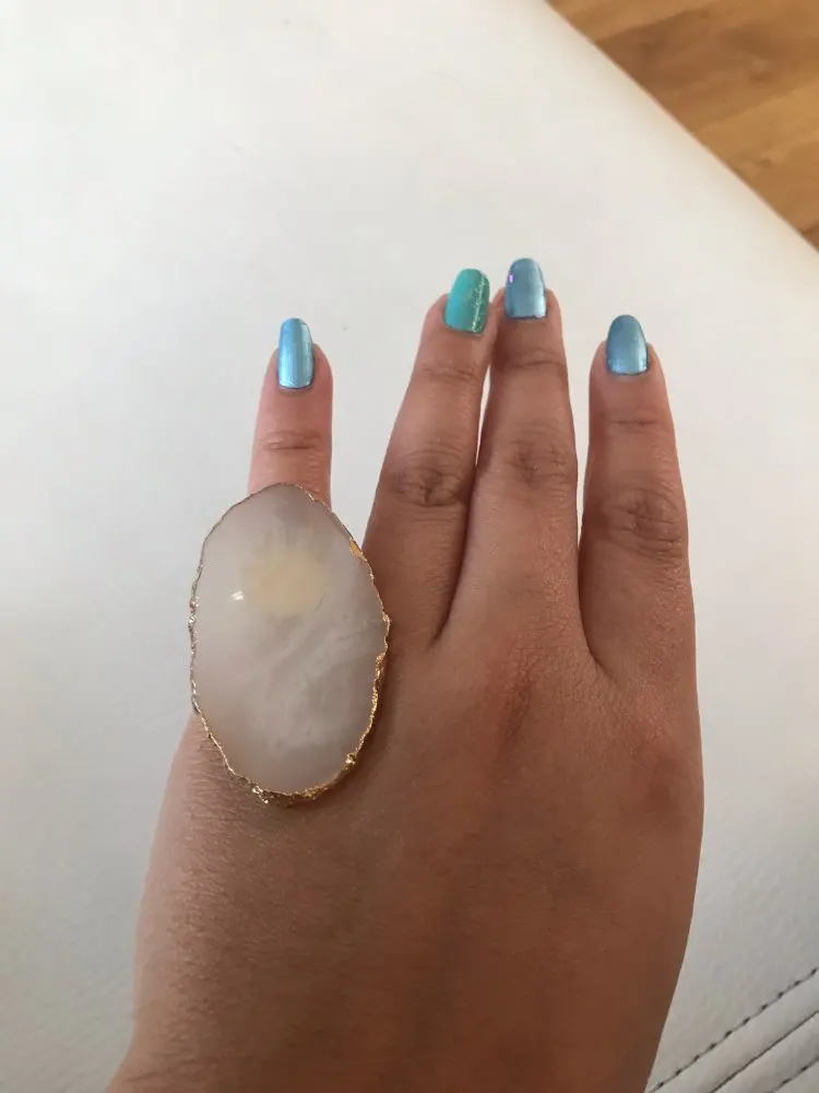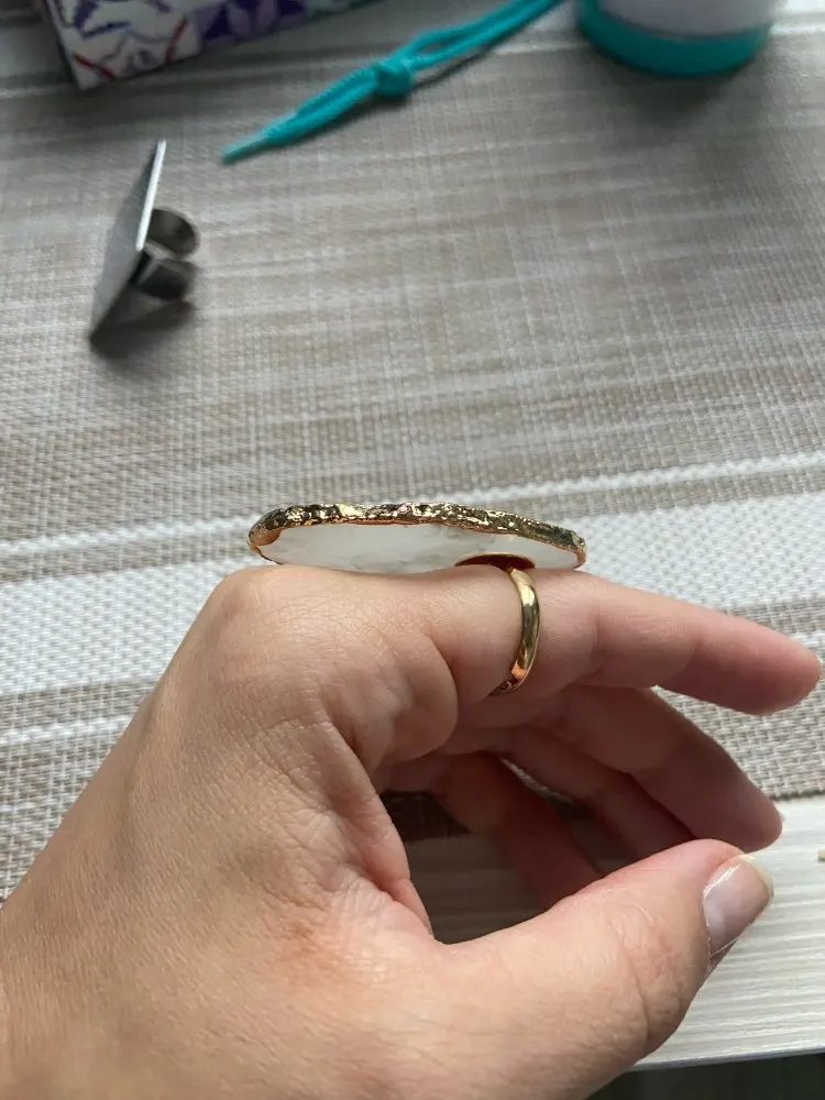 Отличная концепция для тех, кто делает гелевые ногти и хотел бы смешать гелевые цвета или блестки в гели. Кольцо регулируется так, что подходит для всех пальцев. Кажется хорошим и крепким на руке, хороший размер и отличная цена. Долговечность будет проверена с течением времени. Прибыла в Великобританию (Северная Ирландия) около 3 недель.