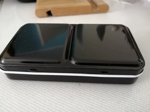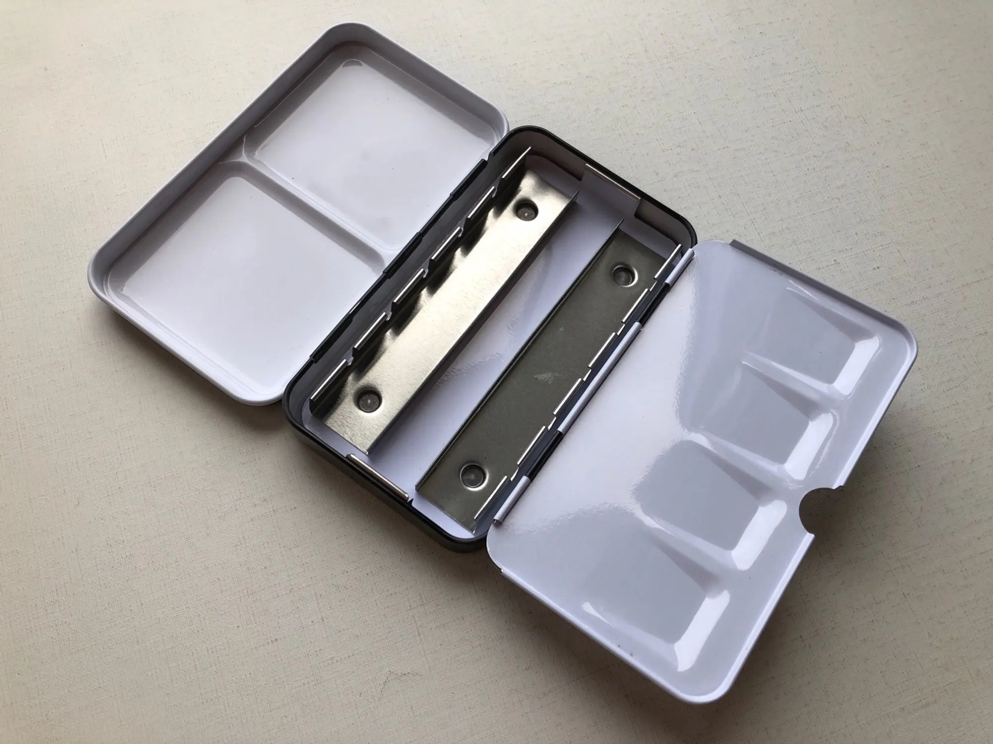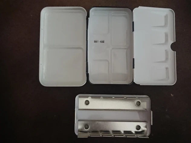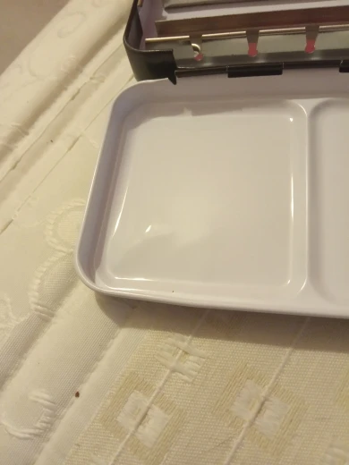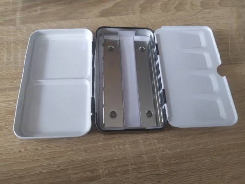 Очень быстро доставили. Пришёл в упаковке с другой посылкой, от другого продавца. К сожалению, соседство с мягкой посылкой не уберегло от вмятин, одна маленькая на крышке есть. Кюветы от красок Белые Ночи в центральный желоб не помещаются, выскакивают под давлением полос металла. Китайские пустые кюветы тоже не лезут. Так что коробка, по факту, на 8 полных кювет.