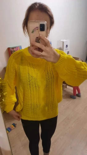 очень яркий лимонный цвет)) прелесть) вязка довольно рыхлая, воздушный лёгкий свободный свитерок. просвечивает. под низ придётся одевать либо майку либо боди с длинным рукавом в зависимости от погоды) свитером довольна, с продавцом не общалась. пришло в казань за 3 недели