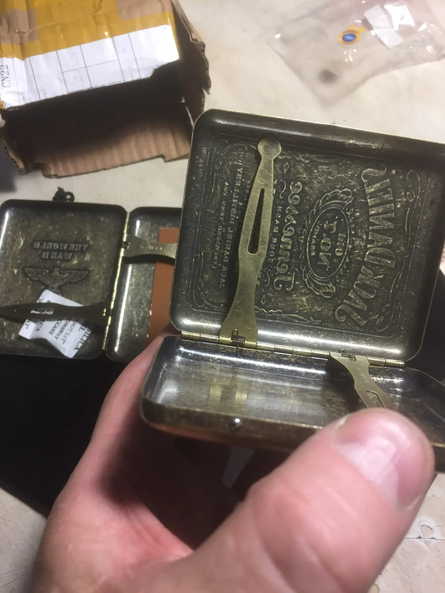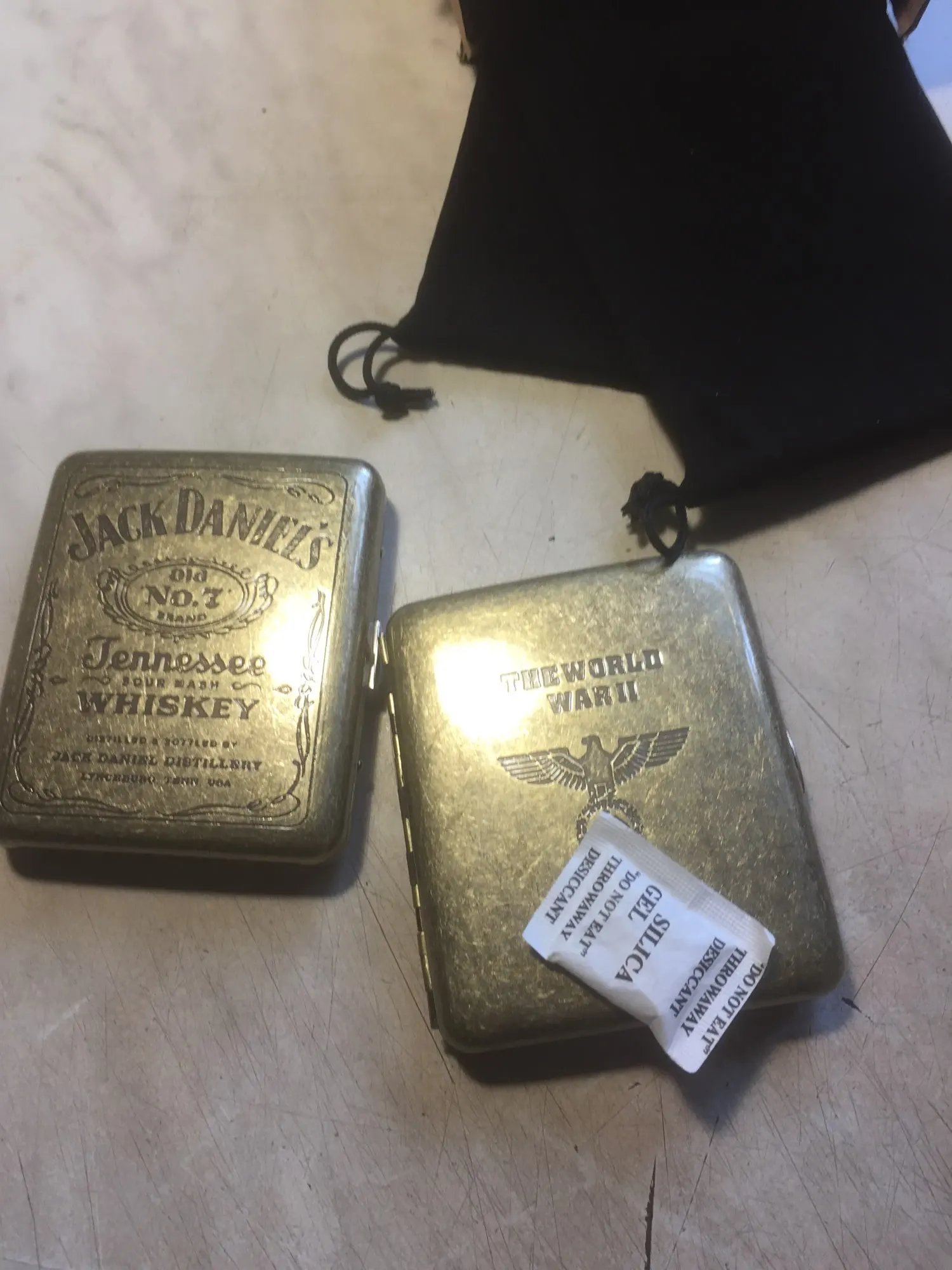 Продавец молодец! В Воронеж заказ пришёл за 13 дней! Описанию соответствует, изготовлен добротно, хорошо упакован. Портсигар выполнен из жести (хорошо липнит к магниту), имеет покрытие «Аля -старая латунь», рисунки и надписи проштампованы приличной глубиной, «запорный механизм»-(кнопка с пластинчатой пружиной) с мягким щелчком закрывает и крепко удерживает верхн. крышку, закреплённую двенадцатисекцыонной петлёй (с противоположной стороны). Однако процесс открывания портсигара- немного сложнее, требует некоторый снаровки (из за гладкой, скруглённой формы и двух пружин-с силой откидывающих крышку) при этом он наровит выскочить из руки. К портс. JACK DANIELS уже заказана похожая зажигалка, а вот к другому «с птицей»-ничего похожего не нахожу, кто знает где заказать подскажите (в вопросах/ответах).