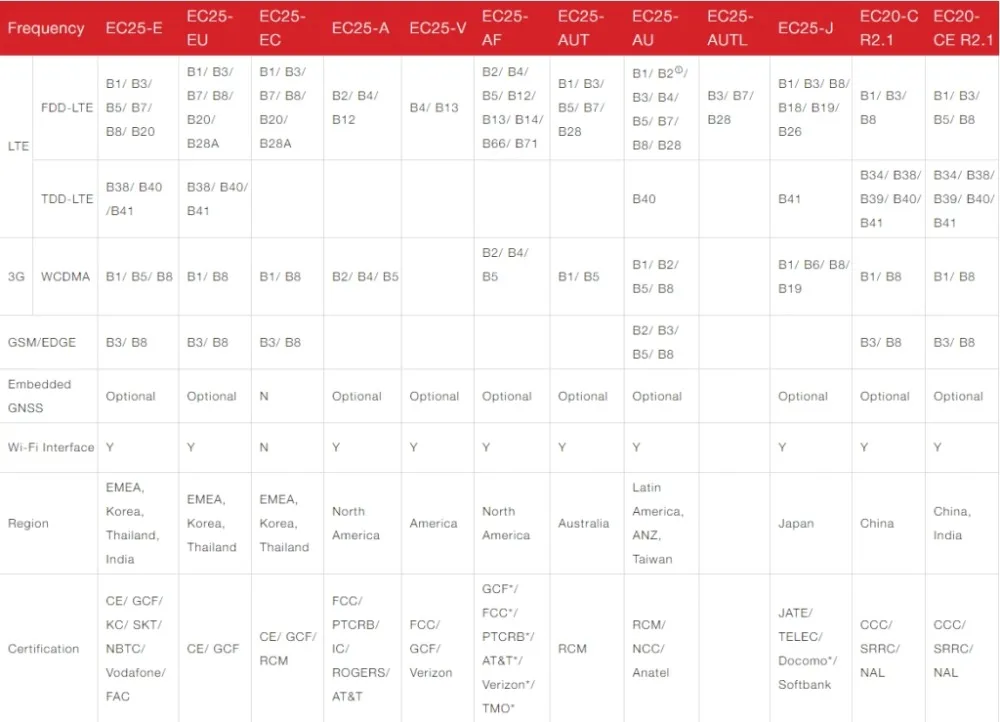 EC25 Mini PCIe содержит 5 вариантов: EC25-J Mini PCIe, EC25-E Mini PCIe, EC25-AU Mini PCIe, EC25-V Mini PCIe и EC25-A Mini PCIe. Это делает его обратно совместимым с существующими сетями EDGE и GSM/GPRS, гарантируя, что он может быть подключен даже в отдаленных районах, лишенных покрытия 4G или 3G.