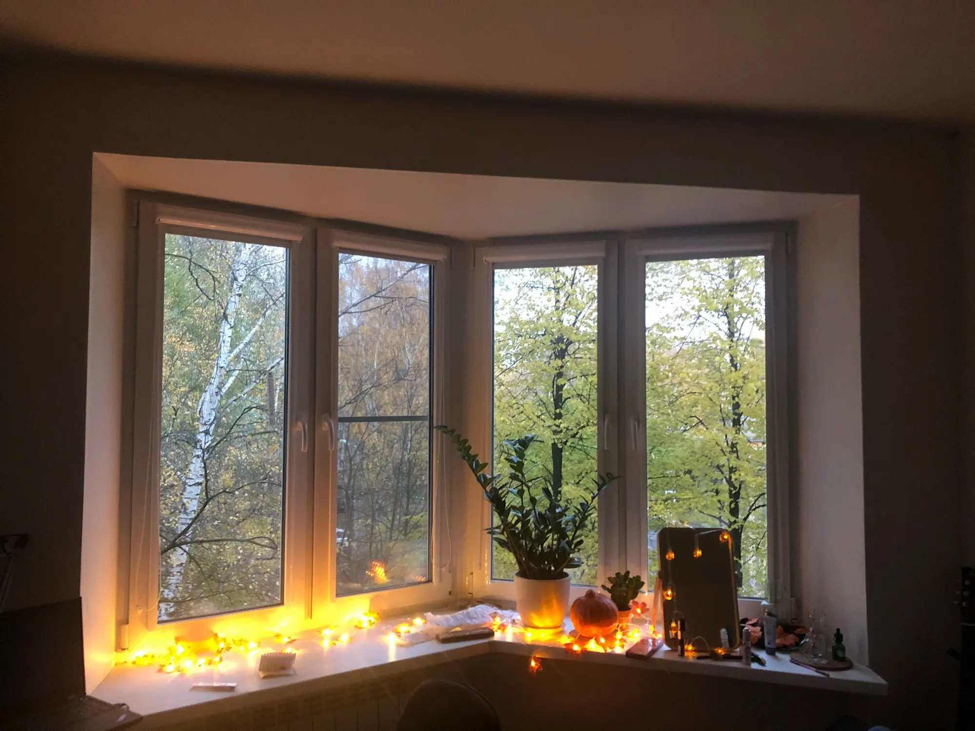 Полутора метров хватило на подоконник стандартного размера в обычной девятиэтажке. Герлянда суперпростая: лампочка, к которой на клеевой пистолет посажён листочек (видела их отдельно продают) и блок для двух пальчиковых батареек. Листочки чуть погнулись. Заказала герлянду для тыквочки с фикс прайса. Организую Хэллоуин на подоконнике уже на следующий год. Тут писали, что она мигает... два раза включила и не заметила. Батарейки вытащила и до осени убрала.