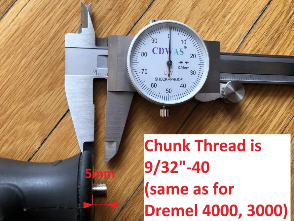 Not bad one. Chunk Thread is 9/32-40 (7.14 mm * 0.635 mm). Inner diameter is 4.3 mm suitable for drill collets 4.2 mm. Понравилась дрелька, но описание скудное + набор насадок хреновенький. Резьба на роторе дюймовая 9/32-40 (7.14 mm * 0.635 mm). Внутренний диаметр 4.3 мм подходит для насадок 4.2 мм. Есть защита от остановки двигателя. Внутри сделано хорошо.