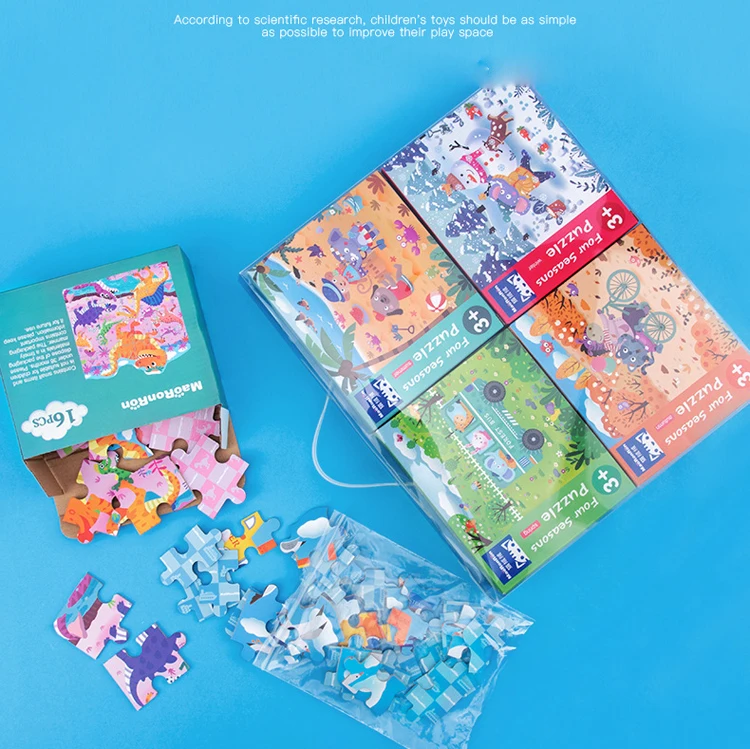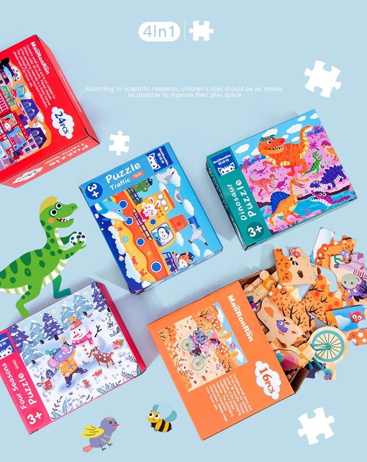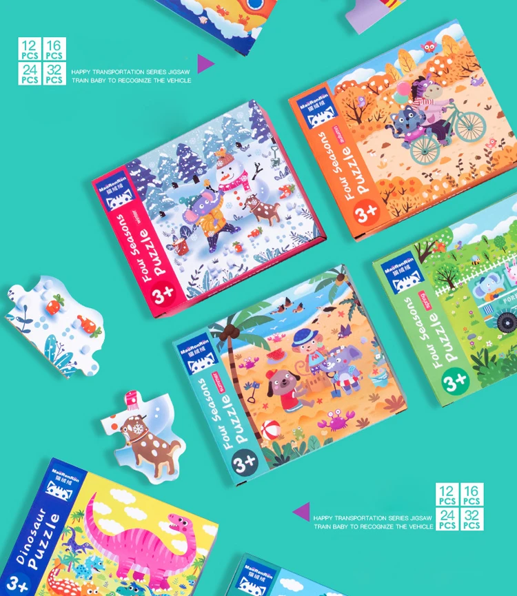 Эта головоломка для взрослых включает в себя 84 шт. в общей сложности, у нас есть тема динозавра/трафика/четырех сезонов, каждая тема состоит из 4 независимых коробок (12 шт/16 шт/24 шт/32 шт), улучшают когнитивные способности ребенка, чтобы постепенно улучшить память детей.