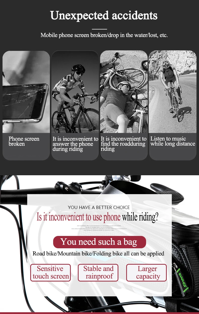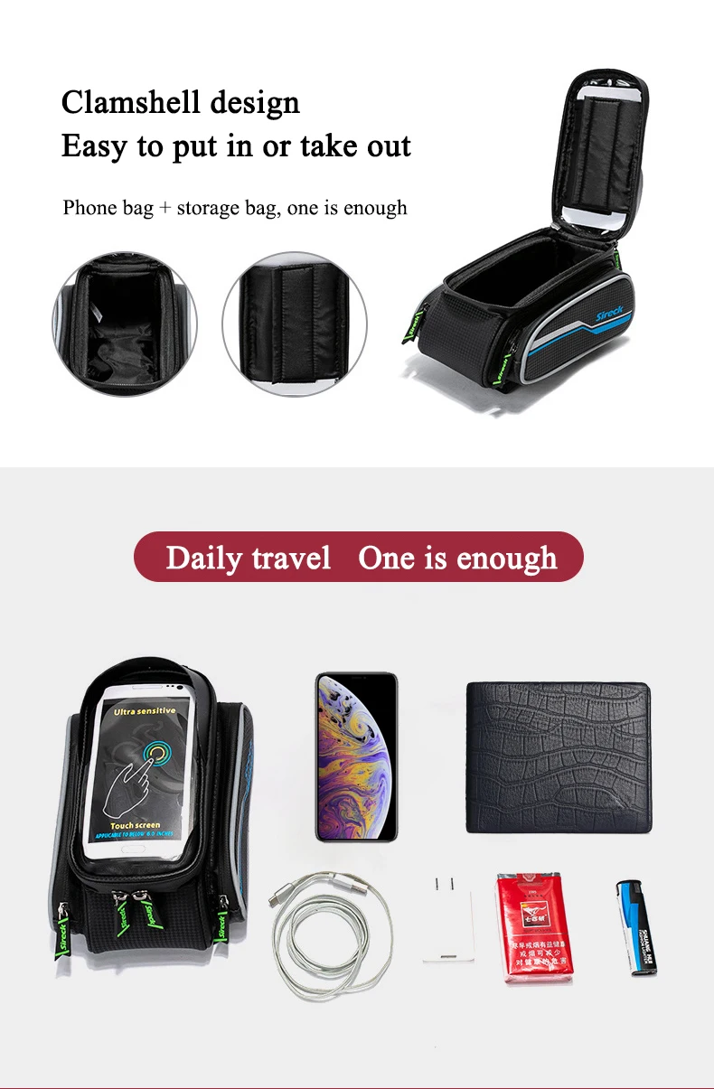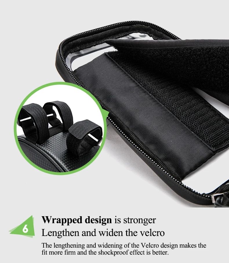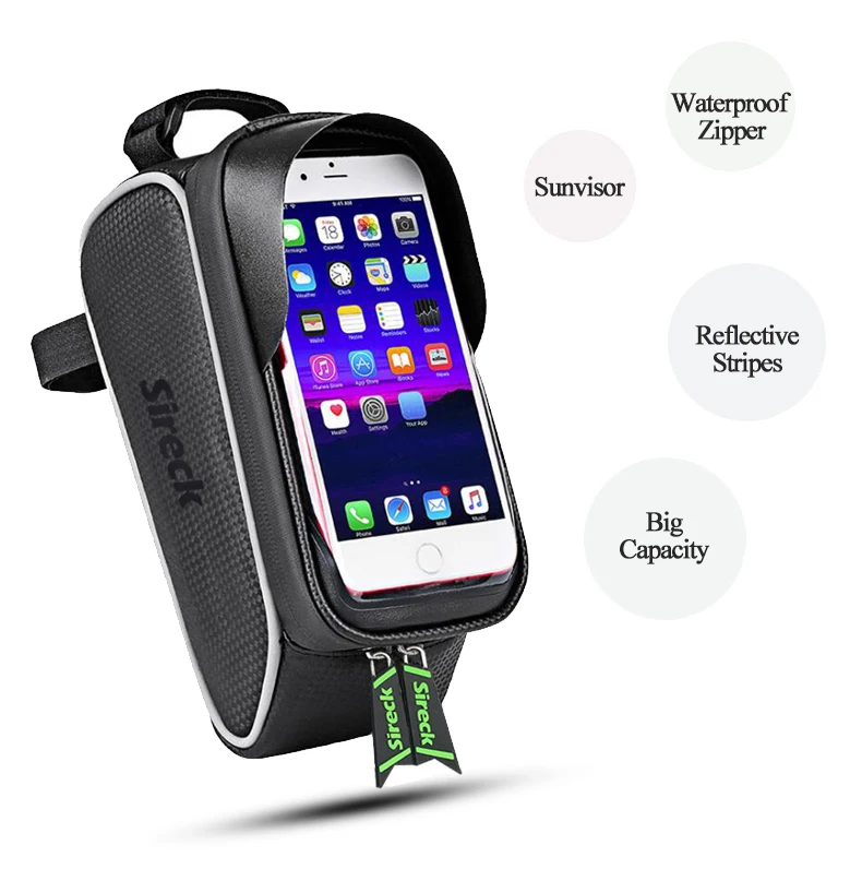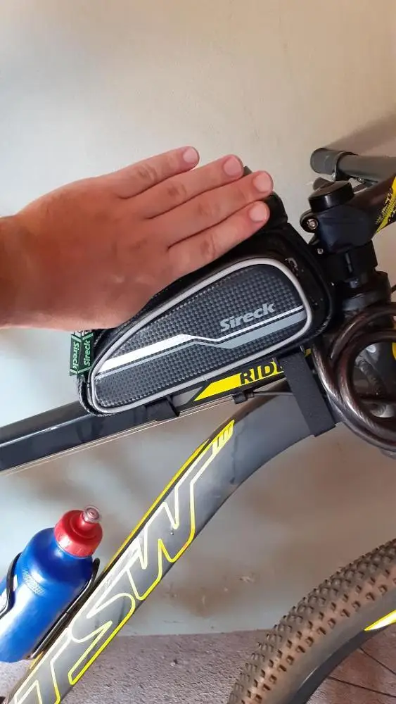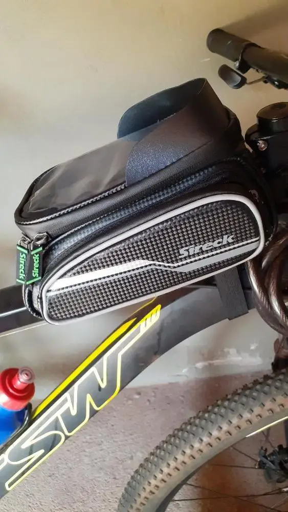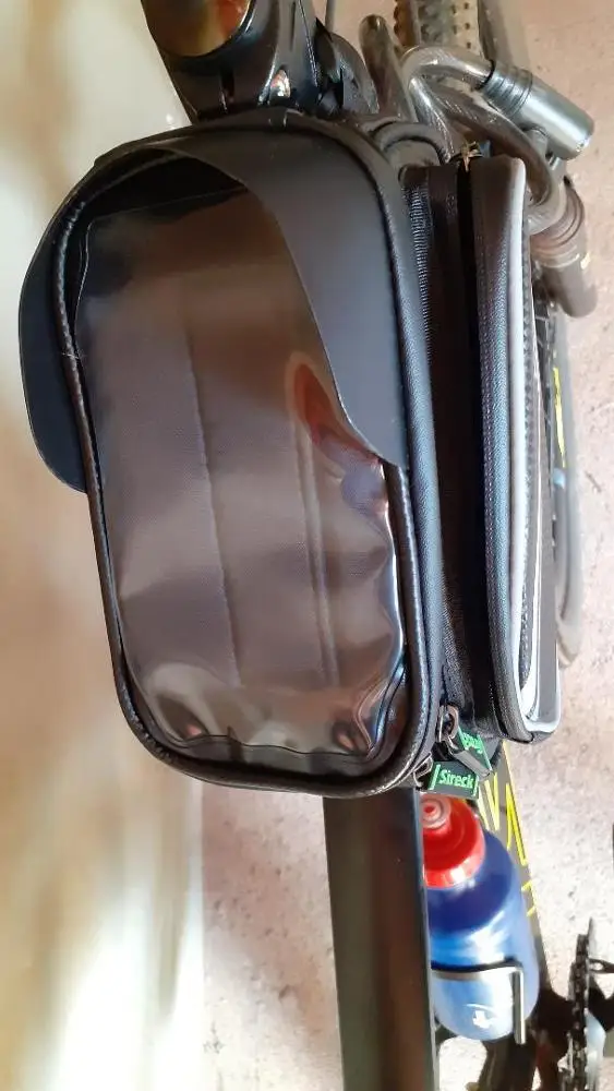 Generally good ohone bag. A lot of space, got in 20000mah powerbank with 3usb connectors. + fit to phone with screen 6.5"(Huawei mate 20pro) - front of bag may get worn quick if put front strap too tight. Handlebar fittings rubbing against bag. Need to create spacer, between bag and post.