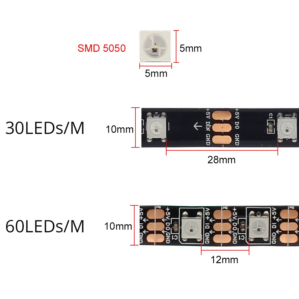Светодиодная лента WS2812B с индивидуальным управлением пиксельным контролем, полноцветная LED RGB полоска с индивидуальным RGB управлением, 5 в постоянного тока, черная ПП