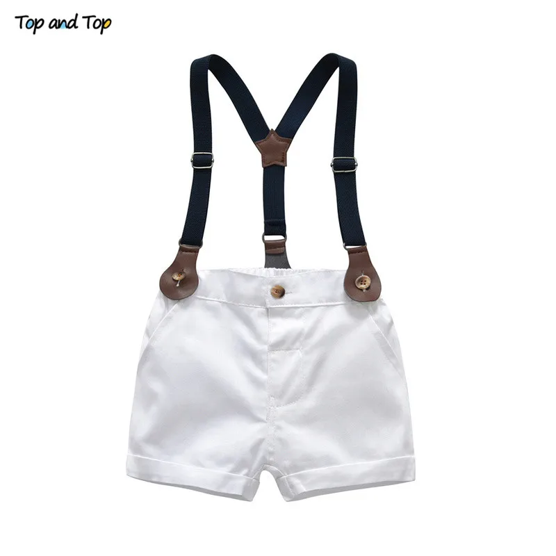 Одежда для маленьких мальчиков комплект одежды джентльмена летний костюм для детей ясельного возраста, рубашка в полоску с галстуком-бабочкой + брюки с подтяжками, Белые шорты нарядный костюм для мальчиков Одежда для детей