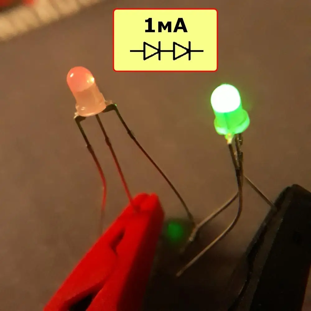 Светодиод - яркий. 5В, 2кОм светит более чем достаточно. Зеленый чуть ярче.