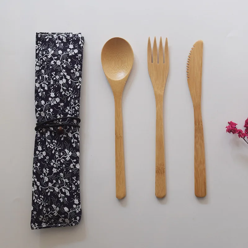 Бамбуковые ножи, вилки, ложки с сумкой, портативная посуда для кемп...