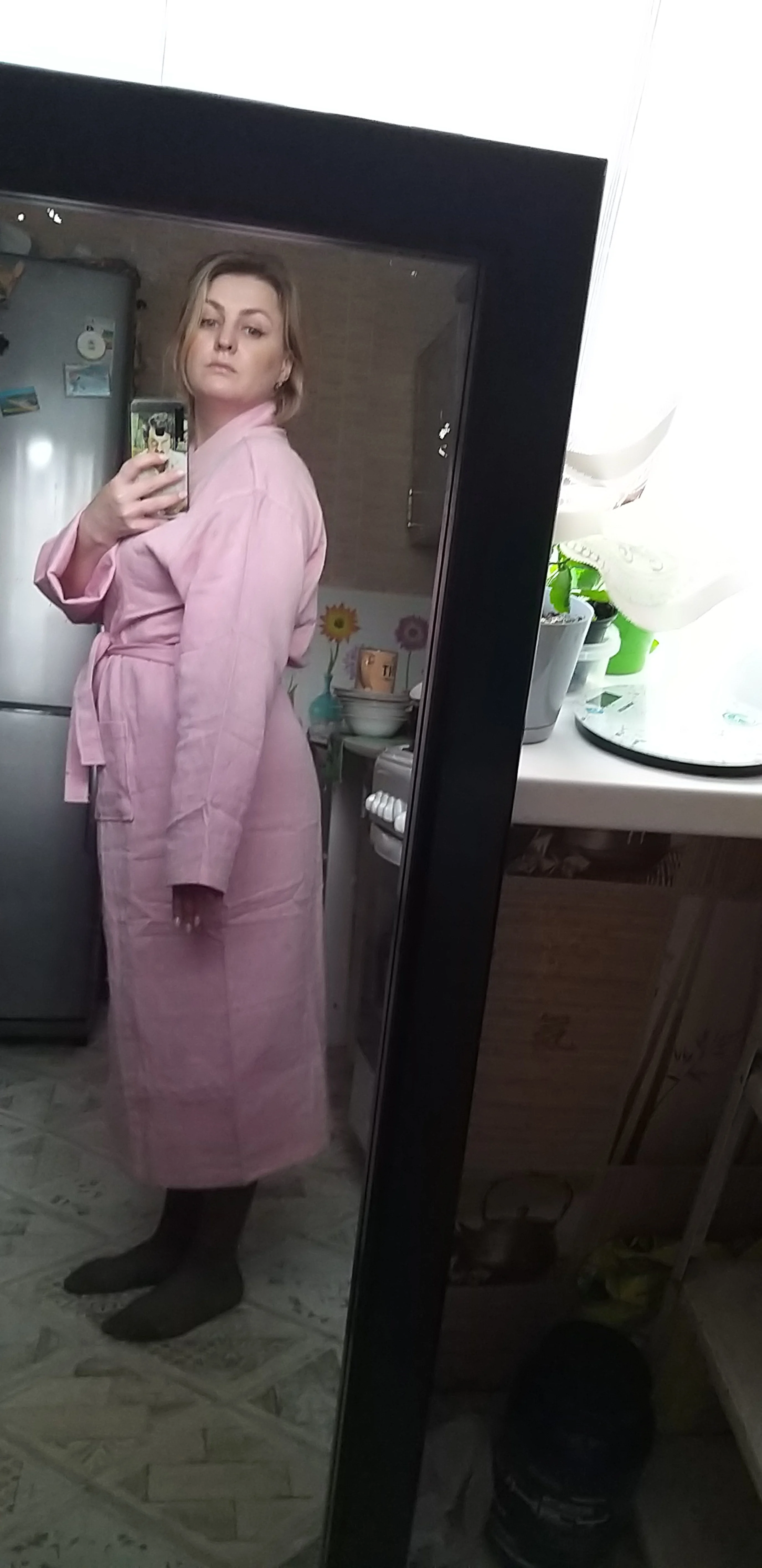 Халат отличный, длина ниже колен, качество хорошее, выглядит как на фото. Ношу 46 размер, заказала размер XL, как раз подошёл. Покупкой довольна. Посылка пришла очень быстро!