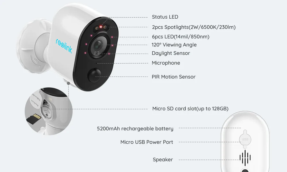 Питание от долгого перезаряжаемого аккумулятора, камера Argus 3 может работать без каких-либо кабелей и хорошо работать во время затемнения. Полностью заряжайте аккумулятор от солнечной панели Reolink *. Вы свободны от замены и зарядки аккумулятора. Установите камеру и забудьте об этом.