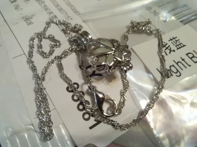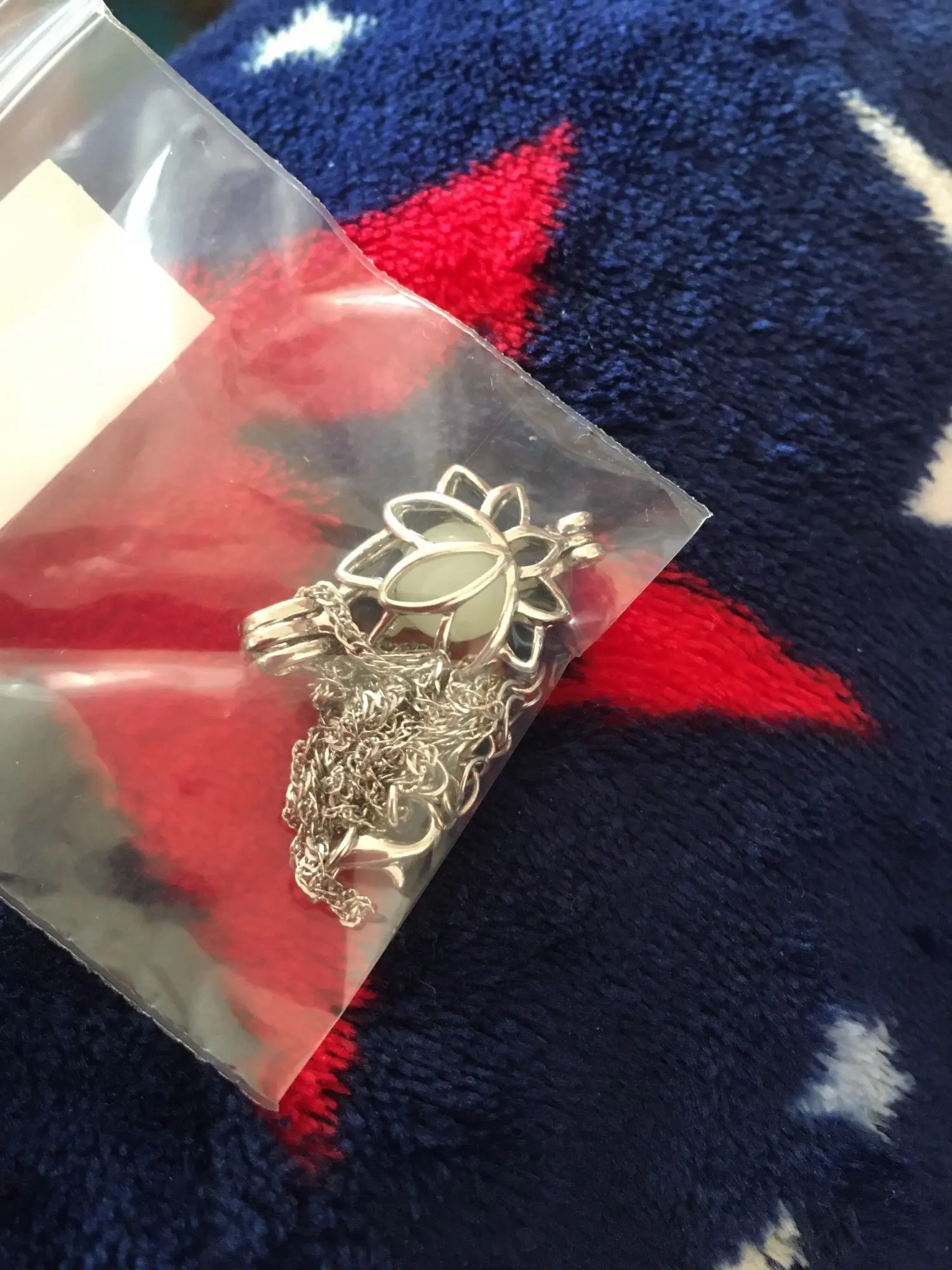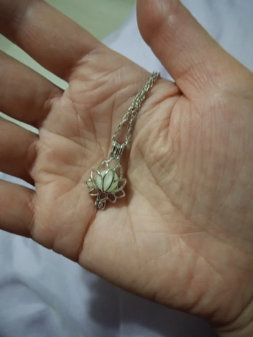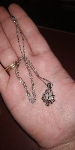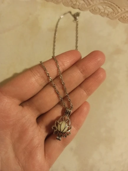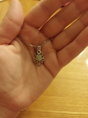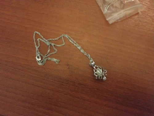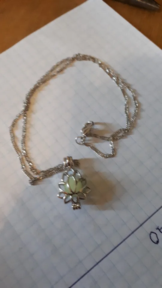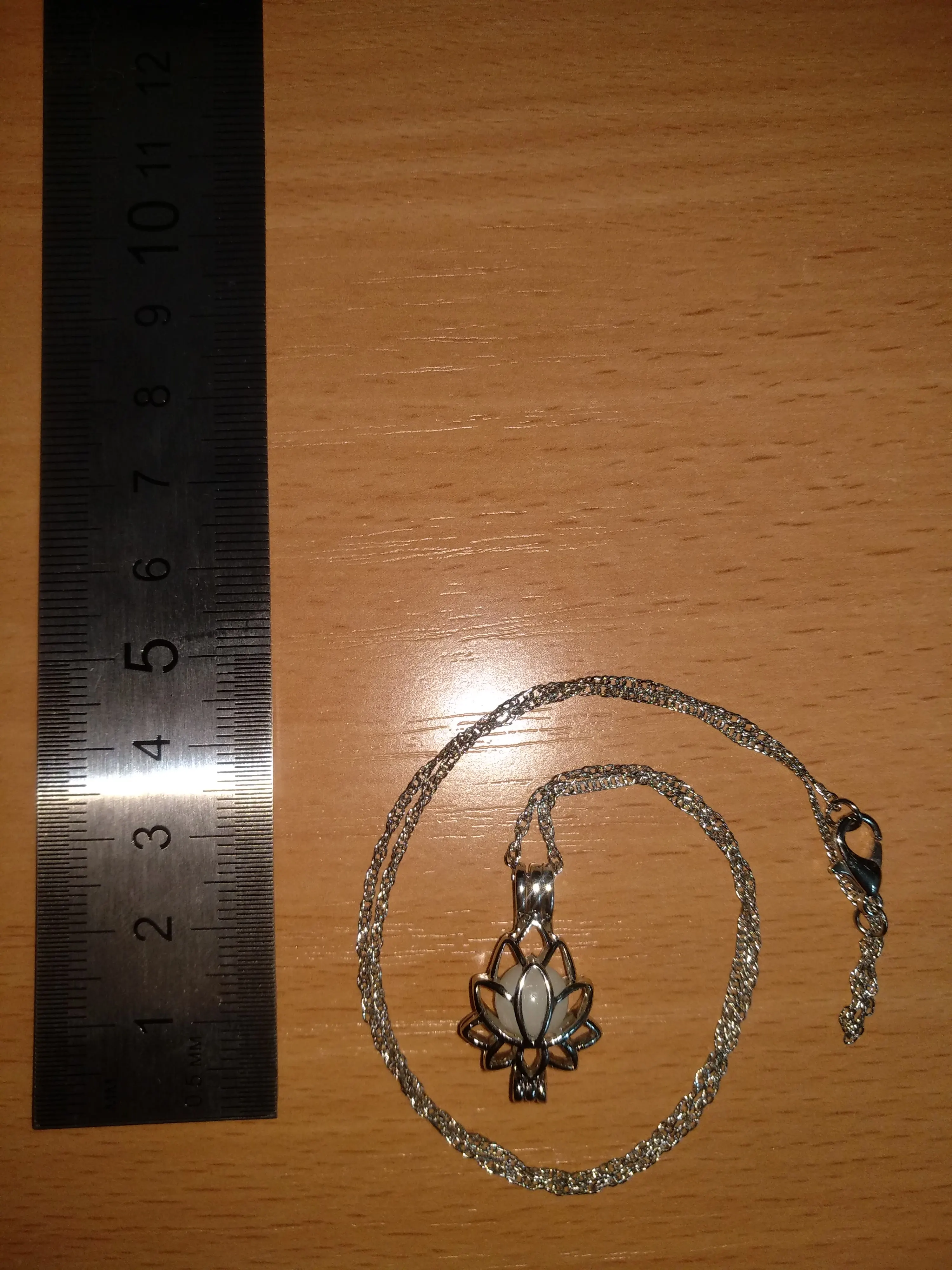 Цепочку поменяю на свою, а вот сам кулон очень симпатичный. В виде лотоса, как и было описано. Заказала с зелёным оттенком, конечно в темноте светится, но не так ярко, как в рекламе. Пришло быстро в посылке с другими заказами. Спасибо за быструю доставку!