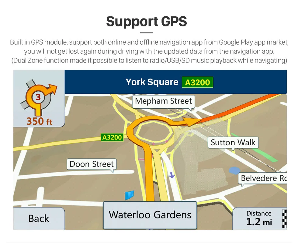 3D навигация: автомобильный стерео оснащен во всем мире в режиме реального времени навигационной функцией высокой точности. Благодаря текущему местоположению, скорости, пробегу, знаковому дисплею здания, 3D виду улицы, поиску места назначения и поворотным голосовым указаниям, он станет вашим идеальным спутником. С функцией dual zone, музыка с радио/AV/DVD/TV и т. Д. Может воспроизводиться за сценой в режиме GPS, и она автоматически переключается на голос GPS.