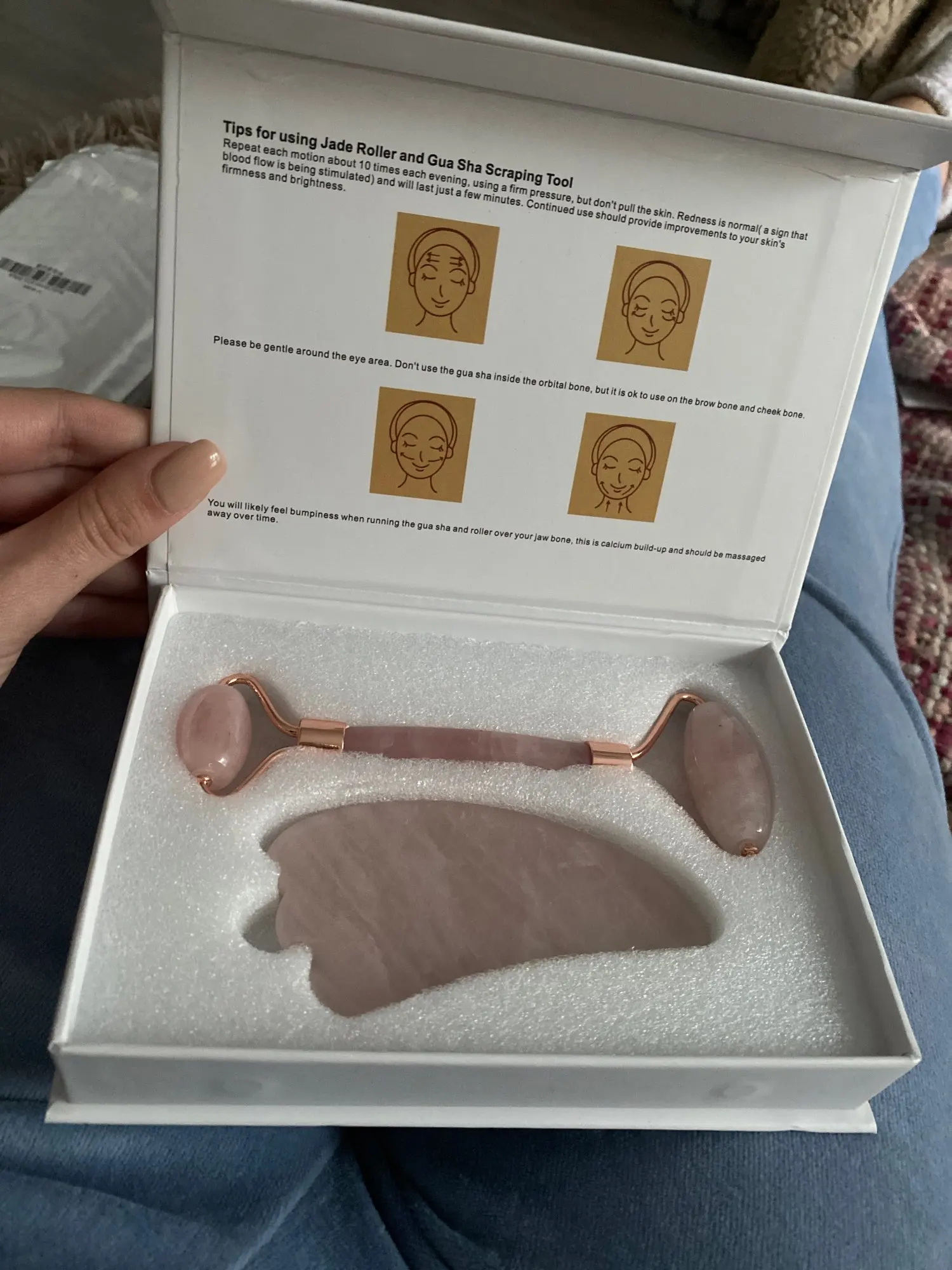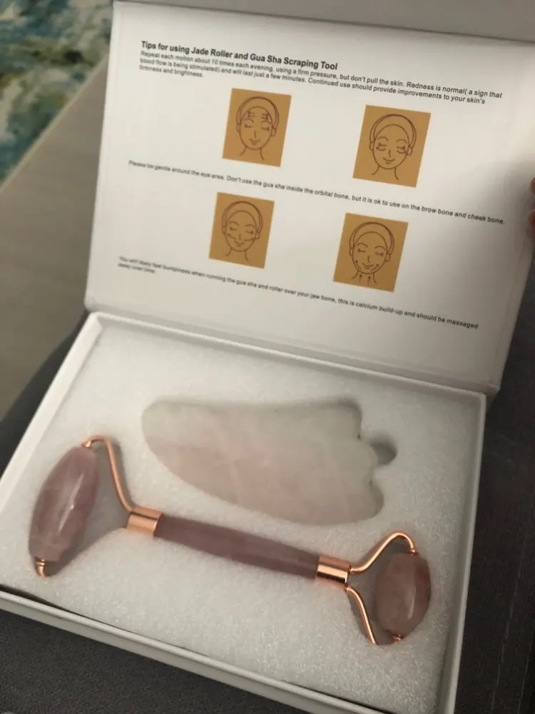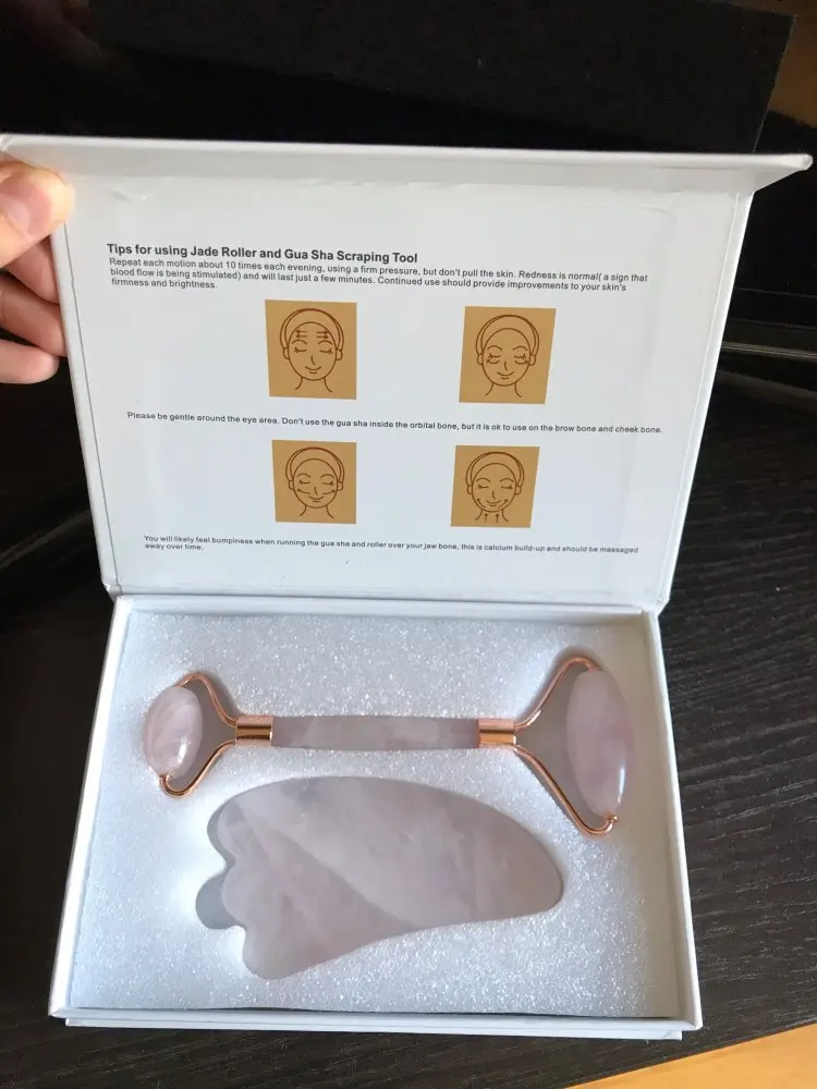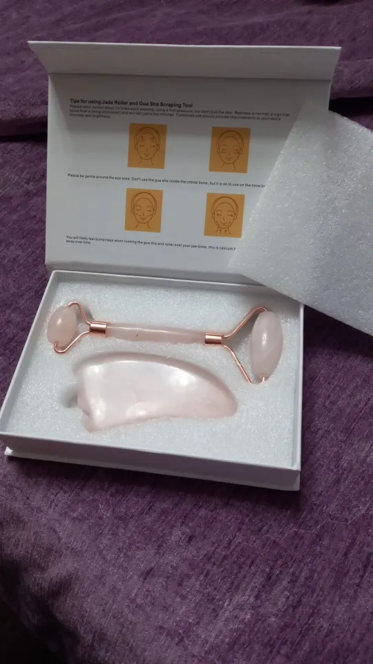 617 руб на распродаже за набор без коробки. Быстрая доставка до пункта выдачи, упаковано было хорошо. Все в целости, без повреждений. Пользовалась и роликом и гуаша. Технику массажа - можно поискать видосы на ютубе. Только отзывы читайте, некоторые неверно делают, не по линиям. От этого и эффекта не будет хорошего. Около года хотела этот набор и наконец-то побаловала себя! Рекомендую! Всем красоты и здоровья!