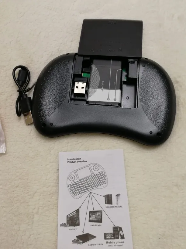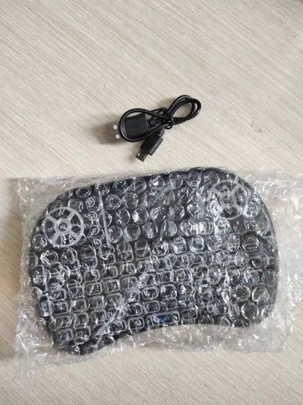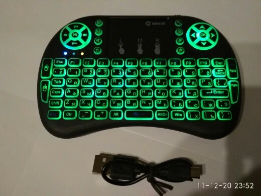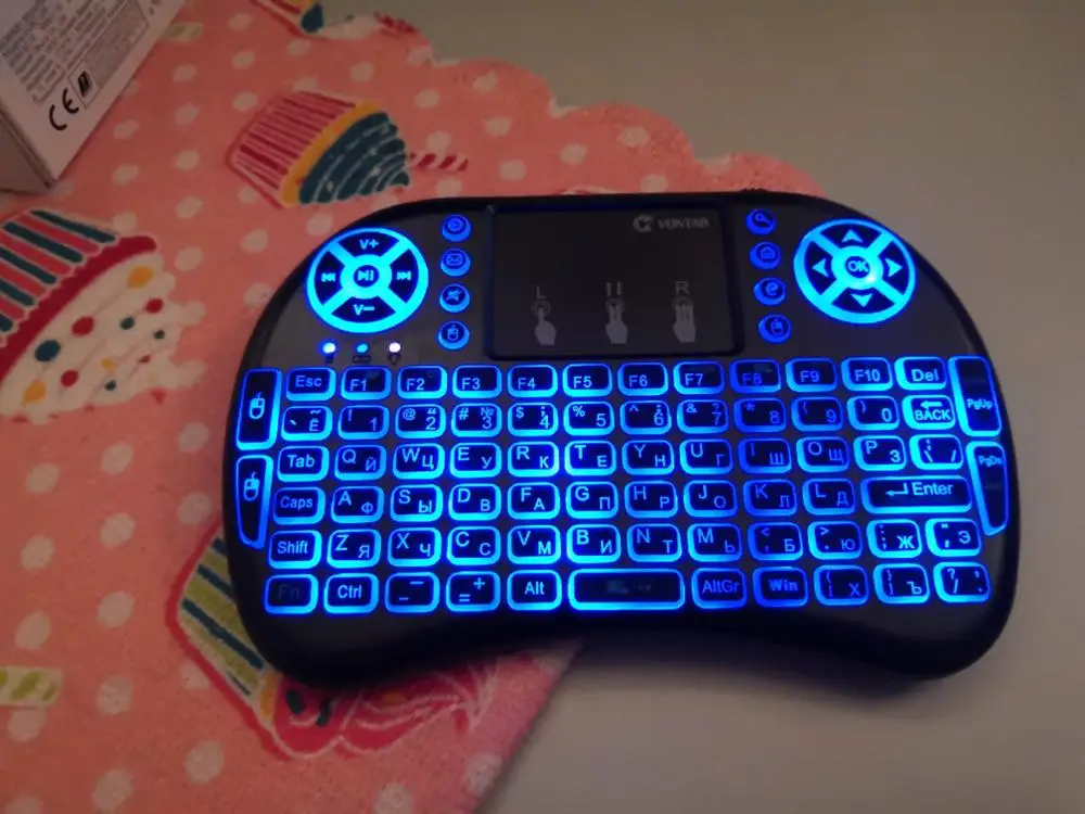 Клавиатура поставляется без коробки, в воздушно-пузырчатом пакете. Также есть короткий кабель MicroUSB для зарядки и бесполезная инструкция на пару страниц. Подсветка (три цвета) включается и выключается сочетанием кнопок Fn+F2, а оттенки цветов изменяются зажатием Fn и проведением по нижнему краю сенсорной панели. Приёмник спрятан под крышкой аккумулятора.
