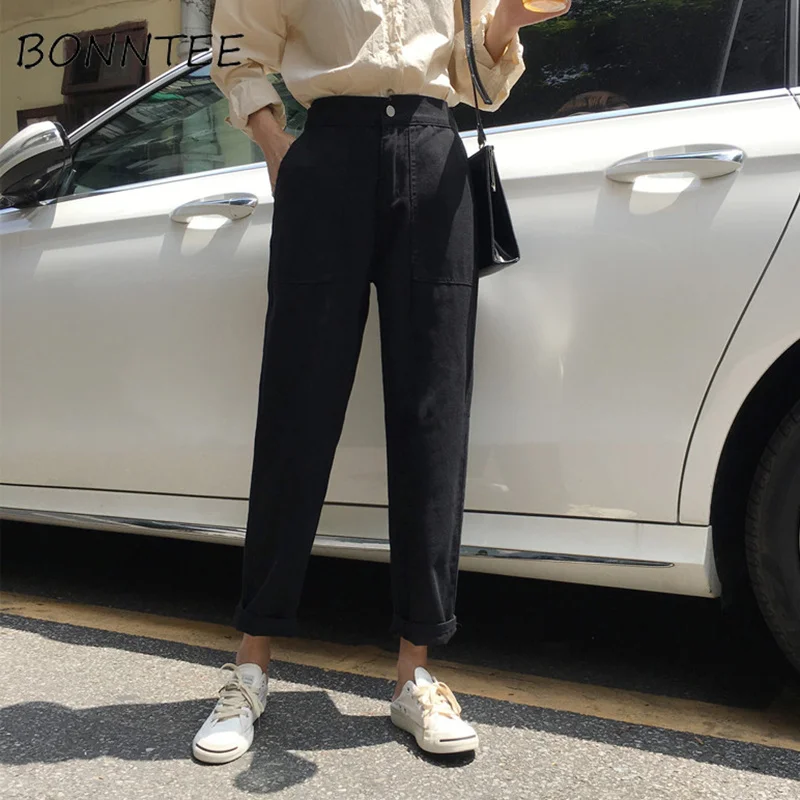Джинсы женские с эластичной завышенной талией, Свободные повседневные брюки с большими карманами, широкие штанины для студентов, модная универсальная одежда из денима