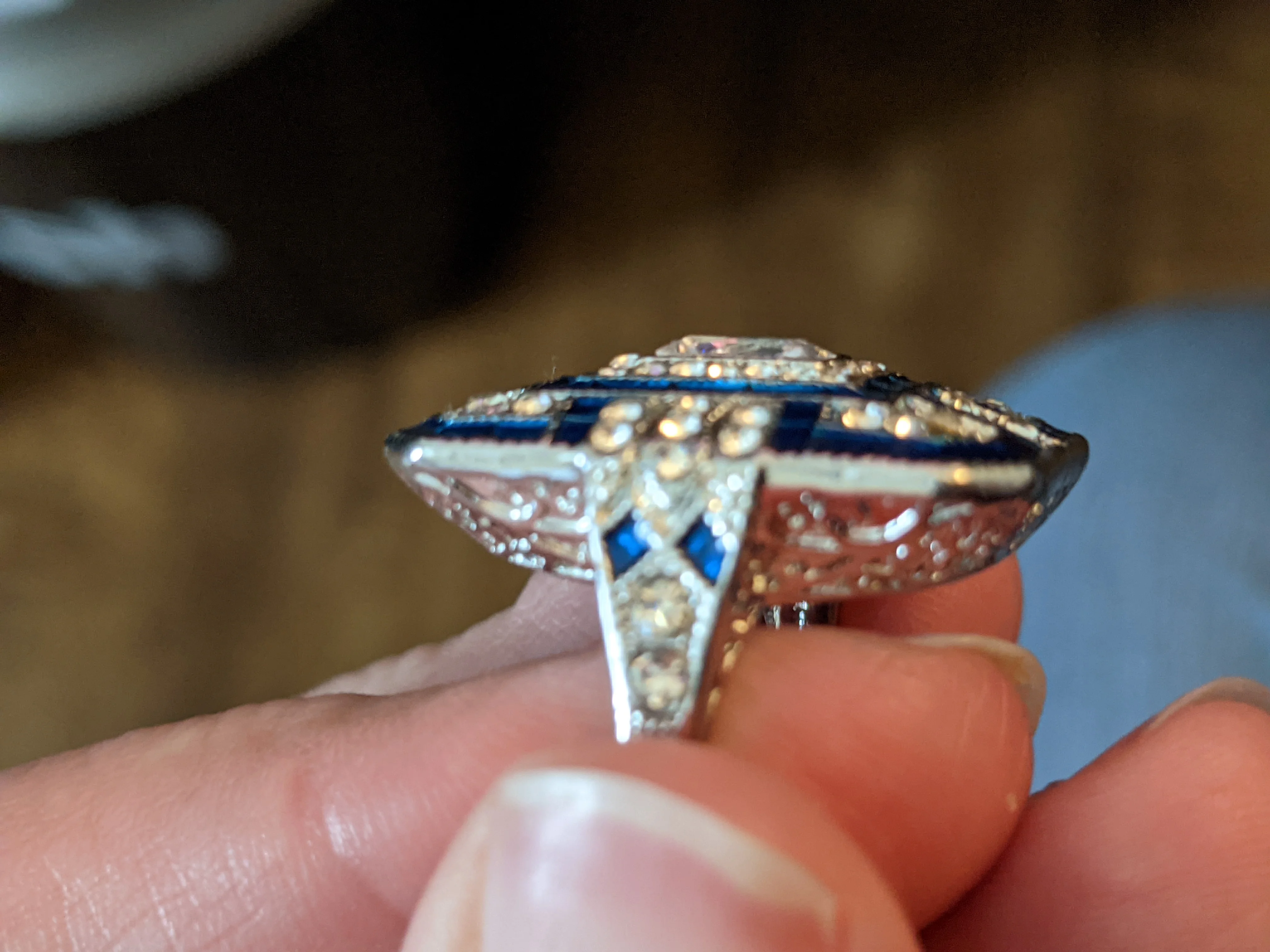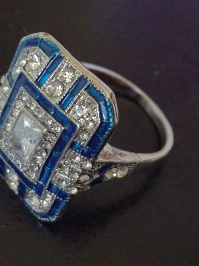 На нем изображены синие камни. Кольцо, которое я получил, было окрашено синей эмалью, а не настоящими камнями, и не таким же количеством прозрачных камней CZ. Это не то, что я ожидала, и это не действительно стоит того, за что я заплатила. :(
