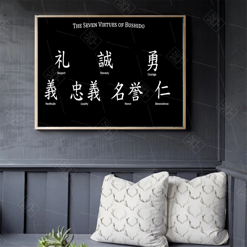 Семь достоинств Бушидо! Абстрактная черно-белая картина японский стиль цитаты постер домашний декор настенная живопись холст