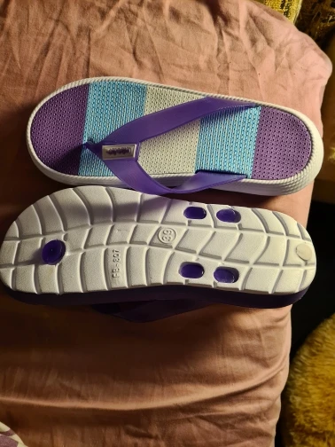 клевые шлепанцы, на высокой подошве, на 24,5см ноги подошли, даже с запасом.. яркие.. очень понравились.. правда, думала сбоку подошва будет прямая, а они как призма с ребром, это немного портит вид, зато песок на пляже точно загребать не будут..