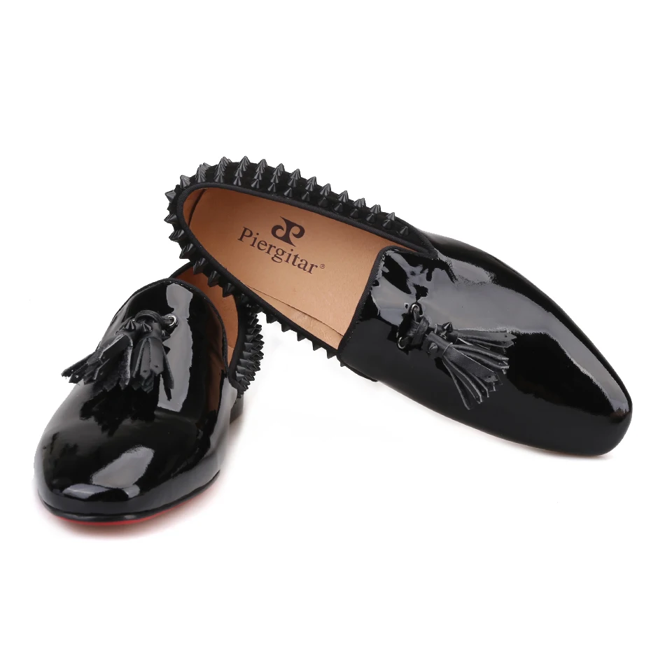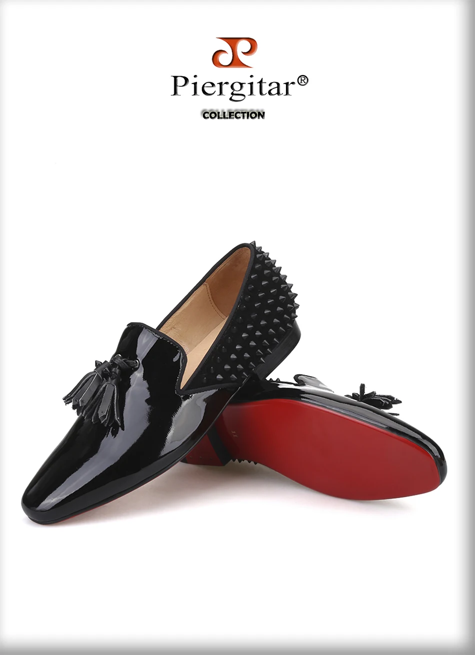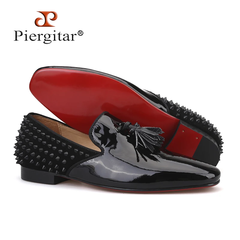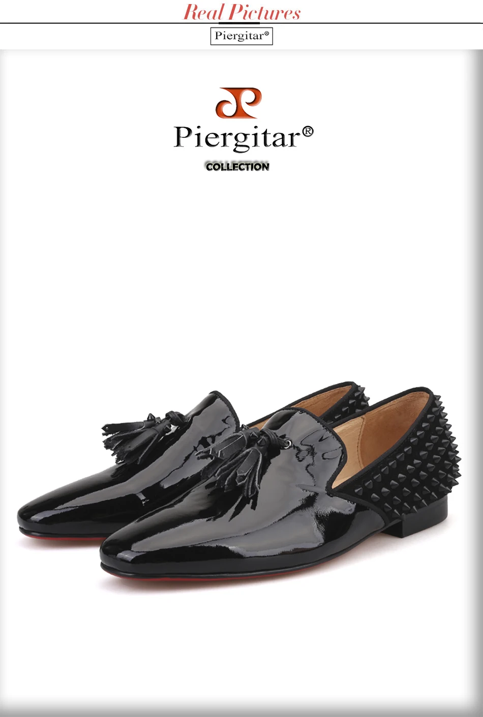 Мужские лакированные туфли Piergitar ручной работы, черные модные мужские лоферы с красной подошвой и бахромой, мужские дизайнерские туфли с шипами на плоской подошве, модель 2020