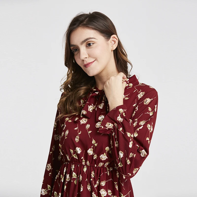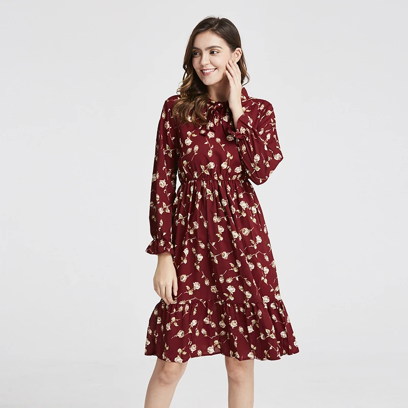 Женское шифоновое платье, элегантное милое платье с воротником-стойкой и бантом, с цветочным принтом и оборками, с длинным рукавом, весна-осень 2020, S-XL