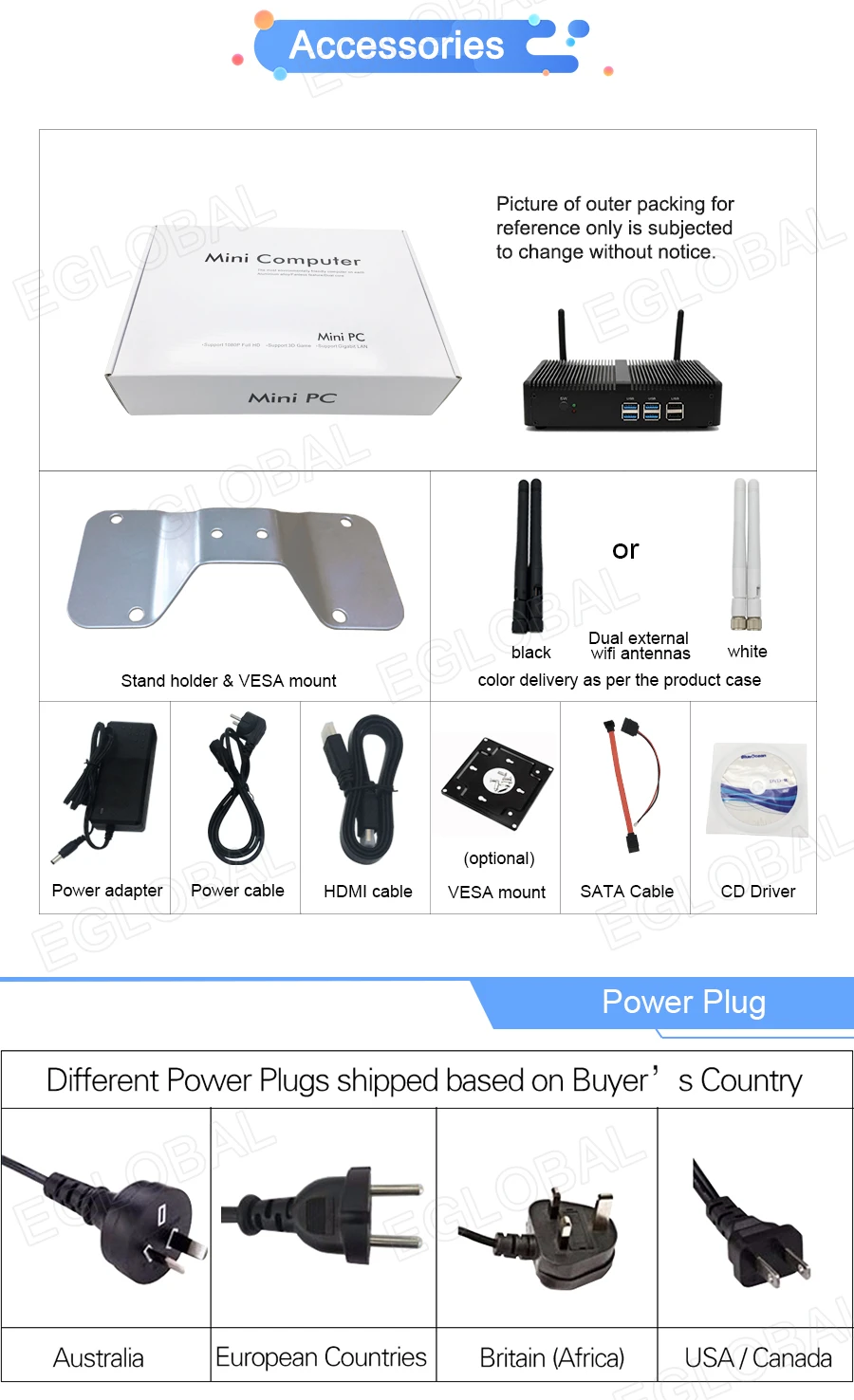 1x мини-ПК1x адаптер питания (правильный штекер поставляется в зависимости от страны покупателя1x WiFi модуль (если вы покупаете «No Ram No HD No Wifi» пакет поставляется no с WiFi двойной антенной,Вы можете нажать"Эта ссылка", Место7 штук = $7 для wifi)1x Подставка и кронштейн для крепления