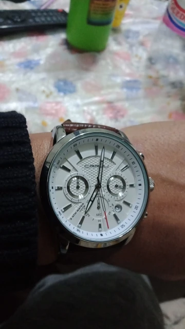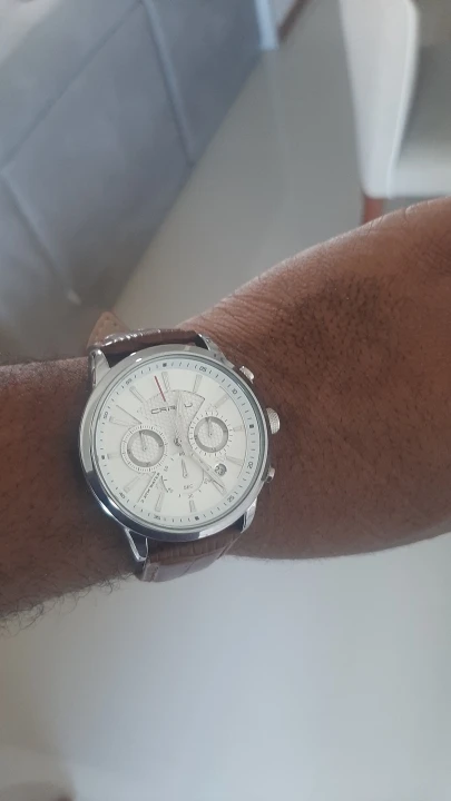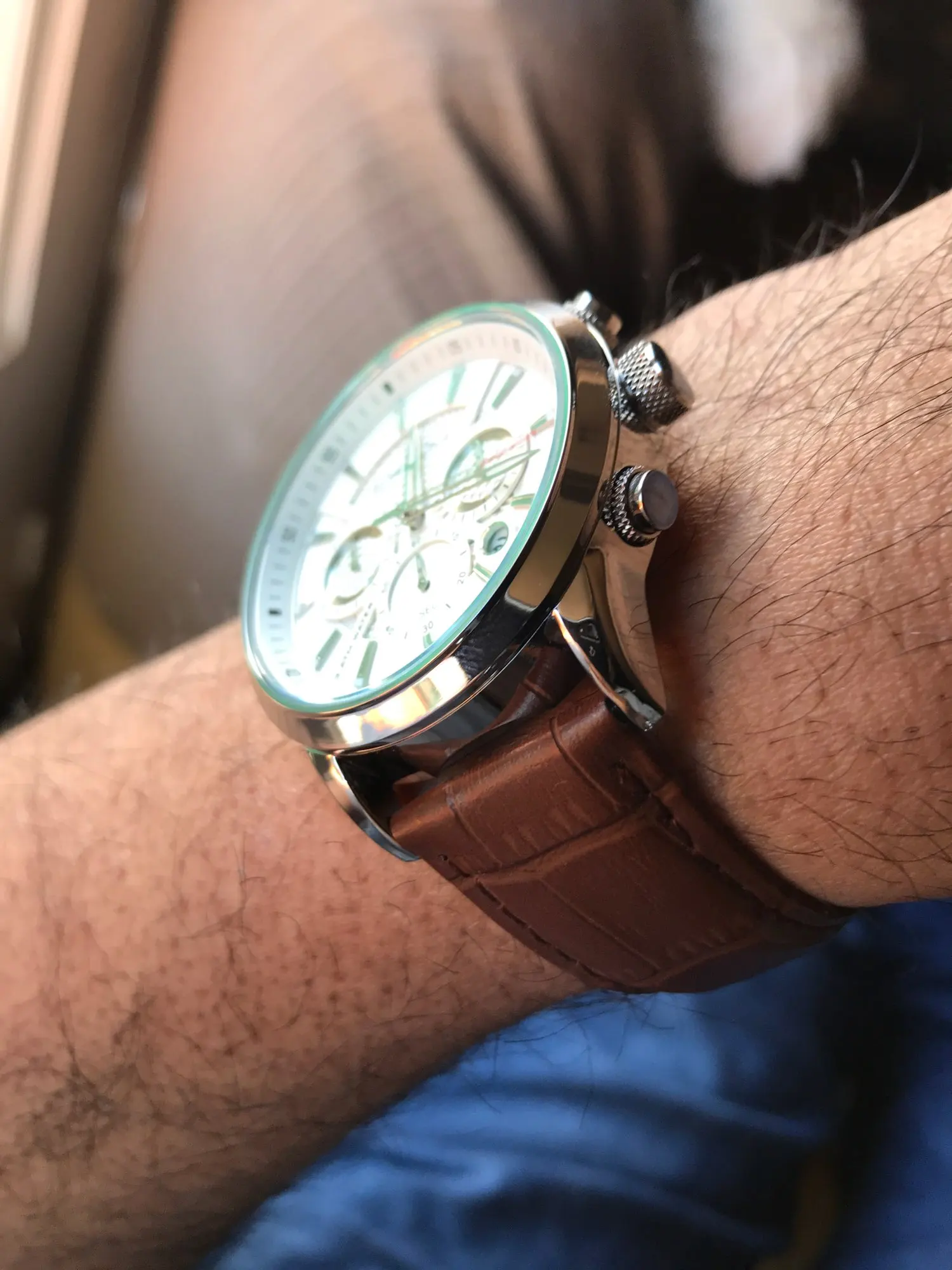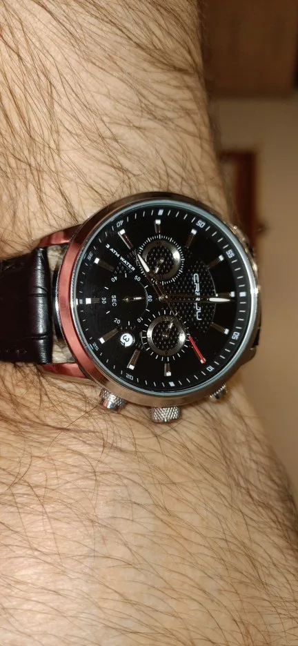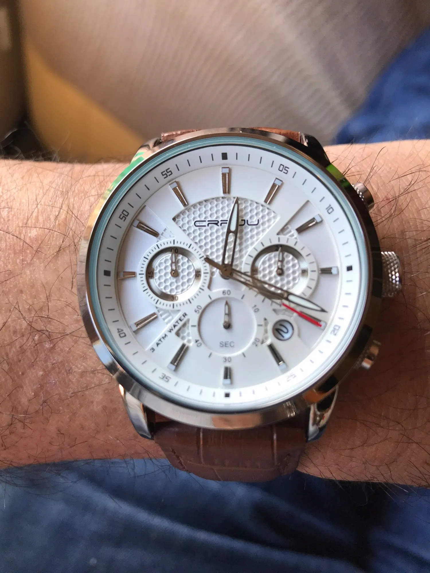 На удивление получил его в течение примерно двух недель, доставка была быстрее, чем ожидалось. Без коробки, но все еще упакованы и упакованы без каких-либо повреждений. Размер часов хороший, но длина ремешка немного длиннее для меня. Браслет изготовлен из натуральной кожи и пахнет им. Одна проблема заключается в том, что секундная стрелка хронографа не настроена должным образом на «12», как должно быть. Еще не пробовал функцию водонепроницаемости. В целом доволен и доволен ценой. Надеюсь, что он прослужит долго.