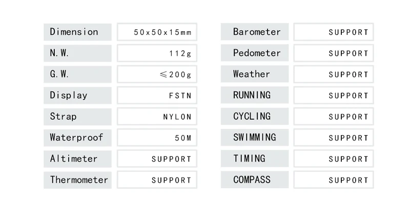 1, высотомер (высота тренда и скорость подъема) 2, барометр (диаграмма тренда давления воздуха) 3, компас 4, термометр 5, прогноз погоды 6, шагомер, счетчик шагов, калории, запись расстояния 7. Функции времени: час, минута, секунда, год (2000-2099), месяц, дата, будний день, 8, будильник (2 комплекта будильника,) 9, таймер обратного отсчета (99:59:59 ~ 0) 10, Секундомер (0 ~:59:59), 12, функции времени в мире (автоматическое переключение времени в летнее время) 13, корпоративный цифровой компас, высотомер, барометр, термометр, тренд давления воздуха и тренд высоты 14, кнопка включения или выключения 15, срок службы батареи 16, EL Подсветка