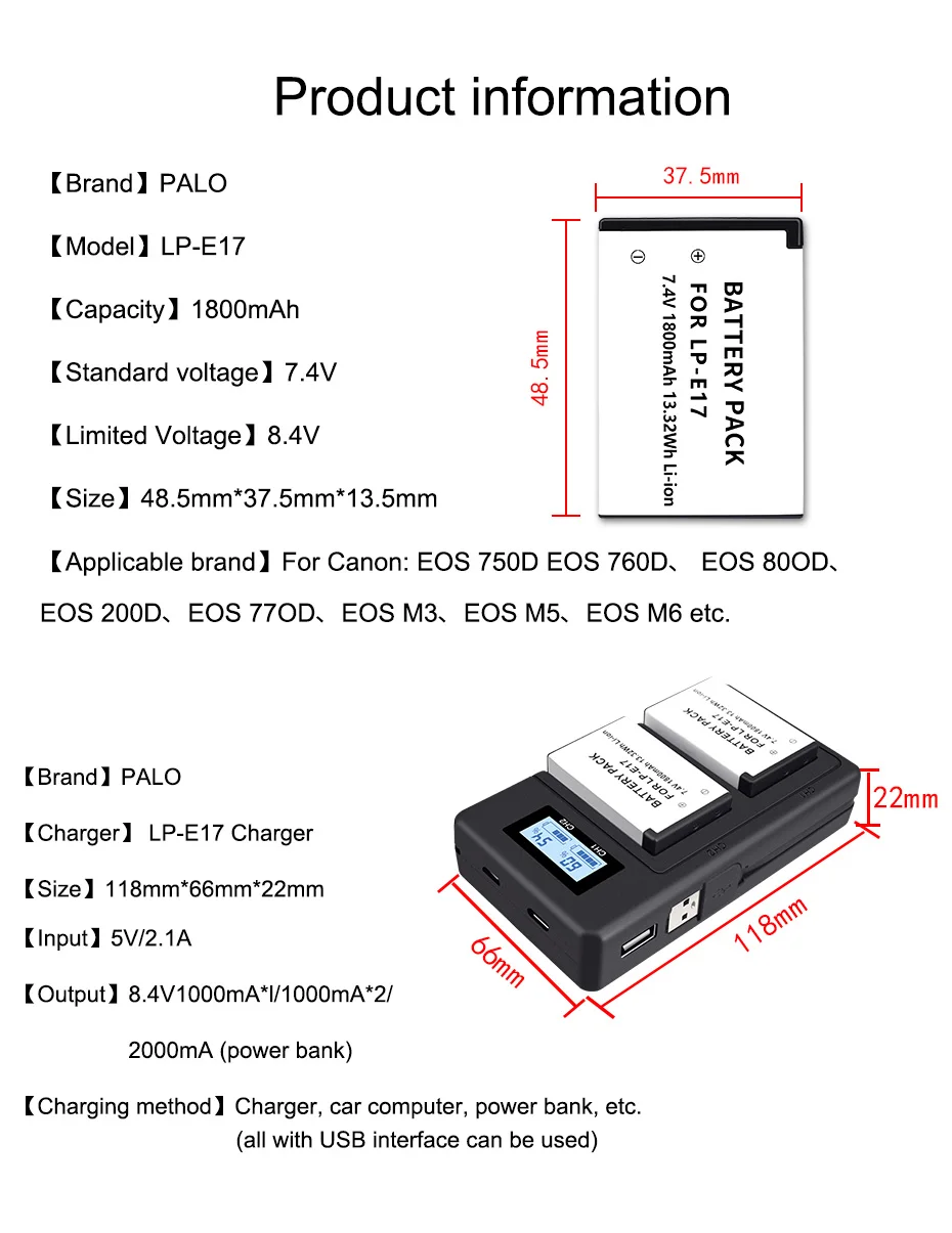 Аккумулятор LPE17 LP E17 LP-E17 E17 + двойное зарядное устройство USB с ЖК-дисплеем для камер Canon EOS 200D M3 M6 750D 760D T6i T6s 800D 8000D 77D Kiss X8i