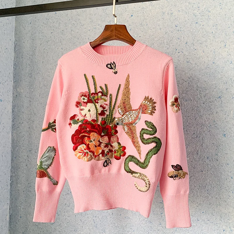 Женский дизайнерский свитер с вышивкой в виде птиц, Голубой пуловер с вышивкой, Рождественский роскошный брендовый вязаный джемпер с бисером, одежда для зимы 2022