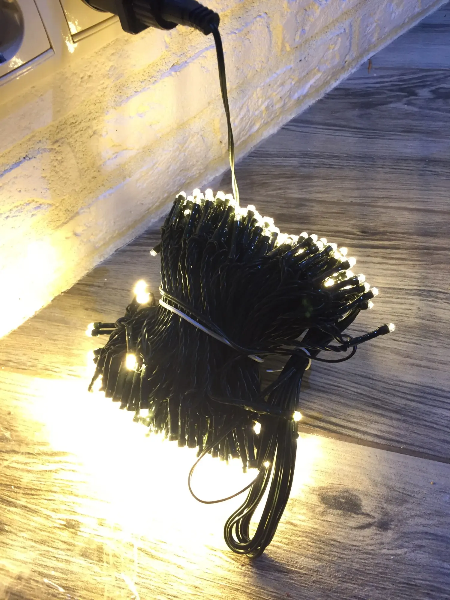 На фото гирлянда с тёплым светом, позже заказала ещё и с холодным. Очень качественная, добротная вилка, провода тоже видно хорошего качества. На этой елке 1,8м высотой 1 гирлянда 300 лампочек! Очень крутая! Рекомендую!