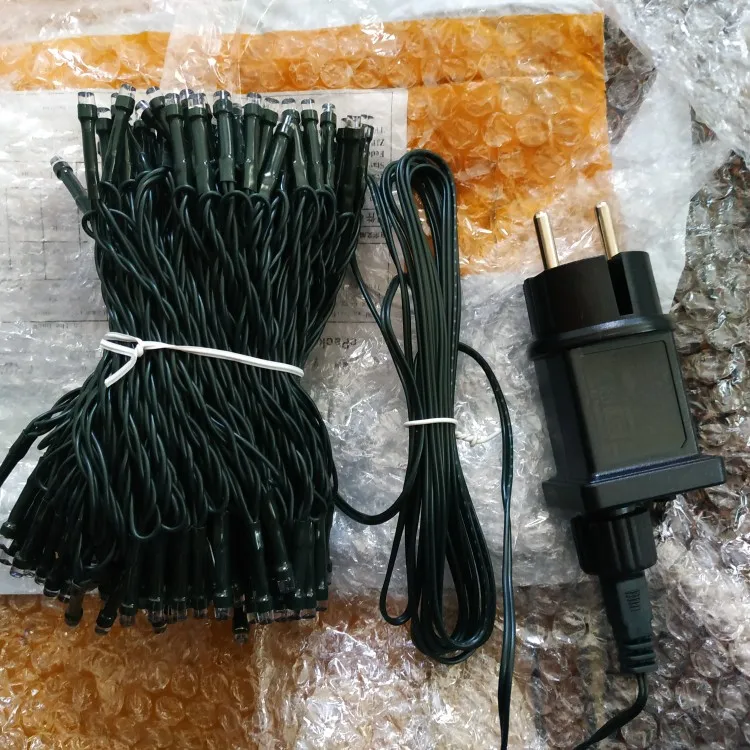 быстрая доставка около 2х недель, еще не разматывала не знаю 100 метров там или нет, но по виду похоже , все работает немно нагревается блок питания незнаю нормально это или нет ну посмотрим, провод темно зеленый как раз для елки!